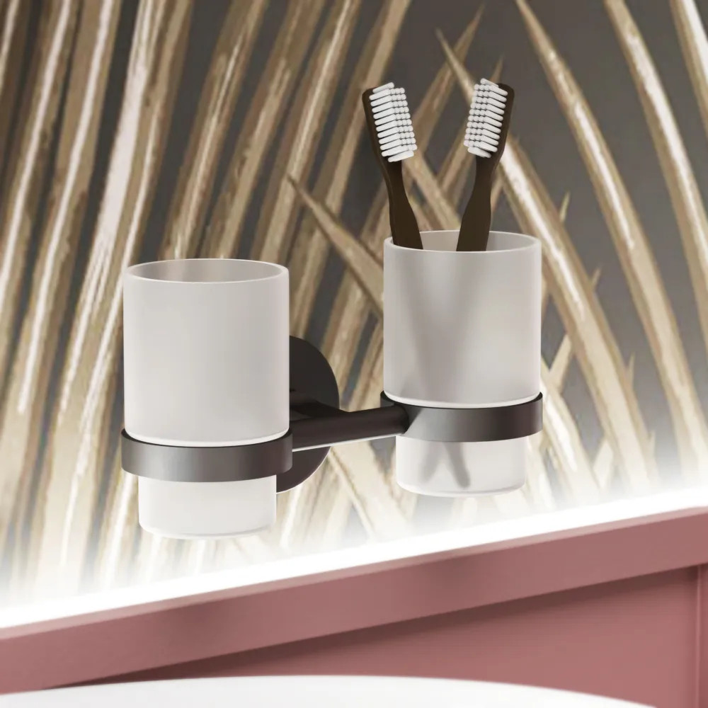 Комплектация: стакан для зубных щеток — 2 шт., держатель с декоративными кольцами, комплект крепежей.