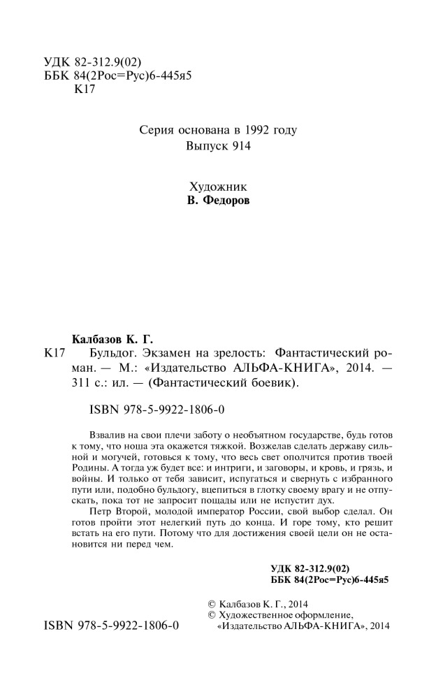 Бульдог. Экзамен на зрелостьКонстантин Георгиевич Калбазов В данный момент этот товар отсутствует в продаже. Возможно, у нас найдется аналогичный или похожий товар здесь. Серия: Фантастический боевик Взвалив на свои плечи заботу о необъятном государстве, будь готов к тому, что ноша эта окажется тяжкой. Возжелав сделать державу сильной и могучей, готовься к тому, что весь свет ополчится против твоей Родины. А тогда уж будет все: и интриги, и заговоры, и кровь, и грязь, и войны. И только от тебя зависит, испугаться и свернуть с избранного пути или, подобно бульдогу, вцепиться в глотку своему врагу и не отпускать, пока тот не запросит пощады или не испустит дух. Петр Второй, молодой император России, свой выбор сделал. Он готов пройти этот нелегкий путь до конца. И горе тому, кто решит встать на его пути. Потому что для достижения своей цели он не остановится ни перед чем. |