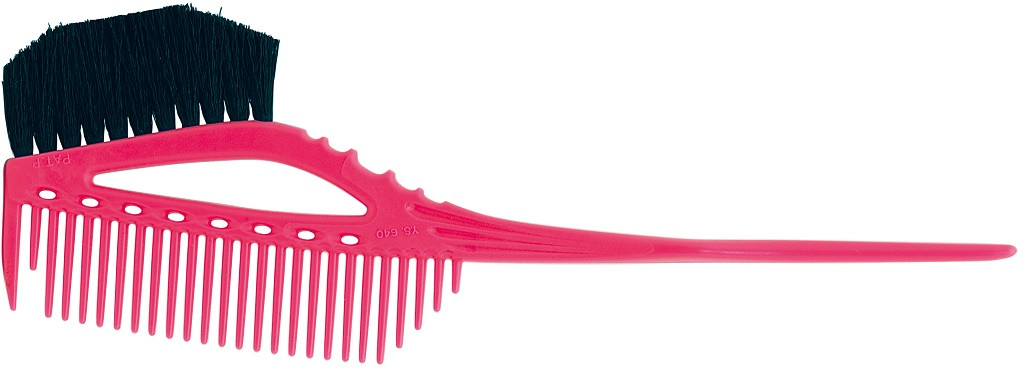 Кисточка с расческой для окрашивания, уходов и стрижки. Изготавливается из специального материала, чтобы выполнять любые манипуляции в процессе окрашивания или ухода за волосами. Специальный дизайн позволяет поставить эту расческу на лаборатории, создавая уникальное удобство в использовании. Также многие мастера используют длинные зубцы этой модели для стрижки.