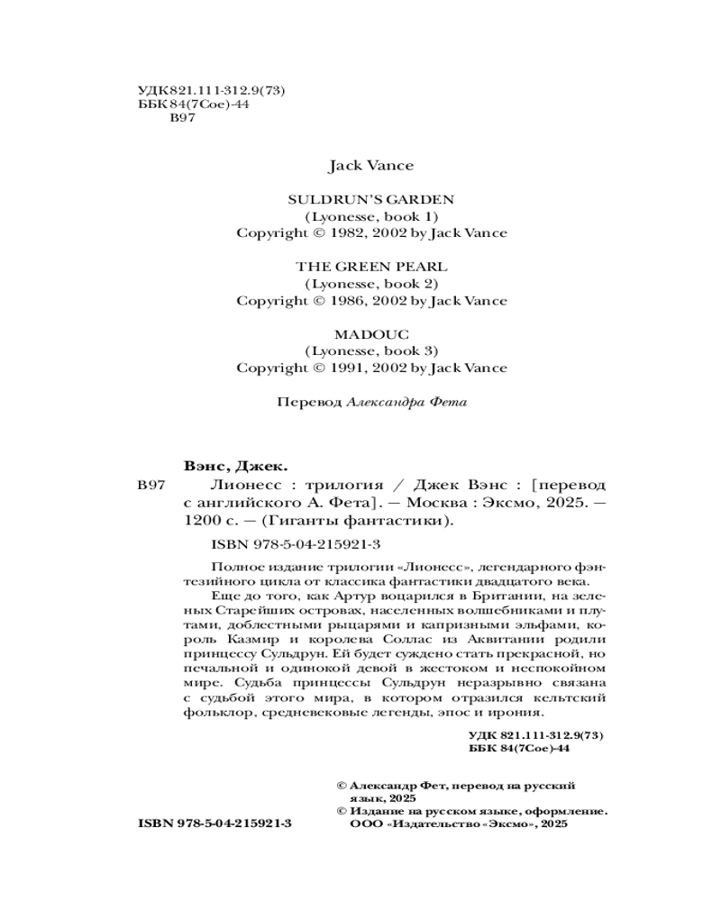 Серия: Гиганты фантастики Трилогия «Лионесс» — вершина яркого таланта Джека Вэнса, выдающегося мастера фэнтези и научной фантастики, жанров, в которых он выработал свой уникальный стиль — детальный, ироничный и богатый в создании миров и культур, столь же странных, сколь и захватывающих.