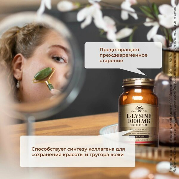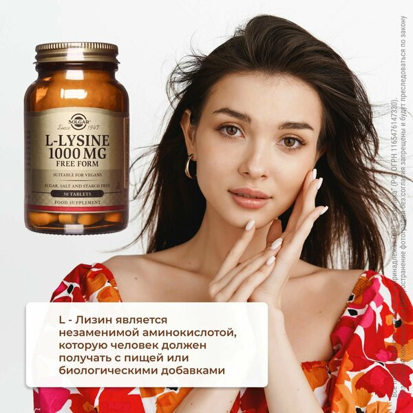 L-лизин является незаменимой аминокислотой, которую человек должен получать с пищей или биологическими добавками. L-лизин способствует синтезу коллагена для сохранения красоты и тургора кожи, предотвращая процессы преждевременного старения. L-лизин способствует заживлению ран, трещинок в уголках губ и оказывает противовирусную активность, особенно в отношении вируса герпеса, способствуя значительному увеличению промежутков между рецидивами.