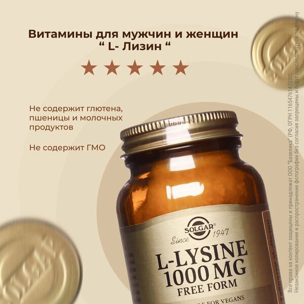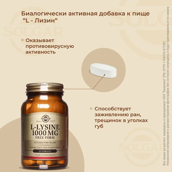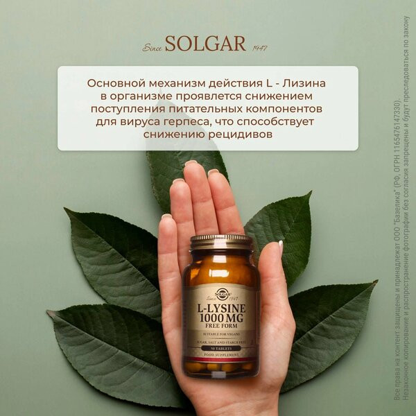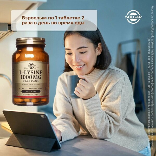 Лизин Solgar рекомендовано пить при повышенной нервозности, частых стрессах, большой физической и умственной активности или снижении половой и репродуктивной функции. Женщине L-лизин поможет избавиться от болезненных месячных и нормализовать менструальный цикл.