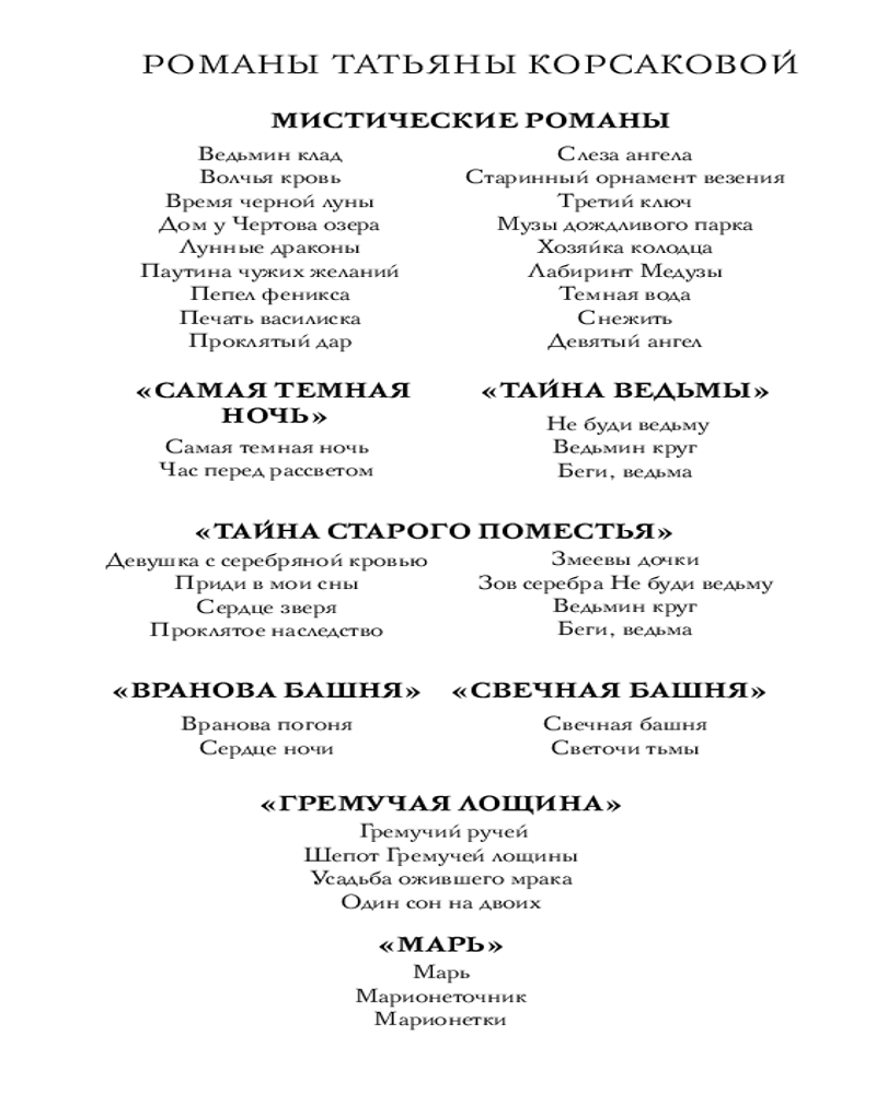 Серия: Татьяна Корсакова. Королева мистического романа. Новое оформление Татьяна Корсакова — популярный автор любовно-авантюрных романов с элементами мистики. Из-под ее пера вышло более двух десятков книг. Сюжеты рождаются из городских легенд, народных сказаний, древних книг и собственной буйной фантазии. На груди у Лии пригрелся амулет — медный диск с полумесяцем в центре. Она носит его с самого детства, не догадываясь, какое влияние он оказывает на ее судьбу. Но в ее жизни уже начинают происходить события, объяснить которые с точки зрения здравого смысла невозможно. Приближается полночь — время, чтобы наконец разобраться, кто твой друг, а кто враг. Это время Черной луны. |