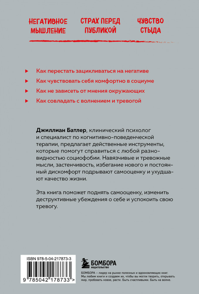 Серия: Карманный психолог. Готовые решения на все случаи жизни Джиллиан Батлер, клинический психолог и специалист по когнитивно-поведенческой терапии, предлагает действенные инструменты, которые помогут справиться с любой разновидностью социофобии. Навязчивые и тревожные мысли, застенчивость, избегание нового и постоянный дискомфорт подрывают самооценку и ухудшают качество жизни. Эта книга поможет поднять самооценку, изменить деструктивные убеждения о себе и успокоить свою тревогу. |