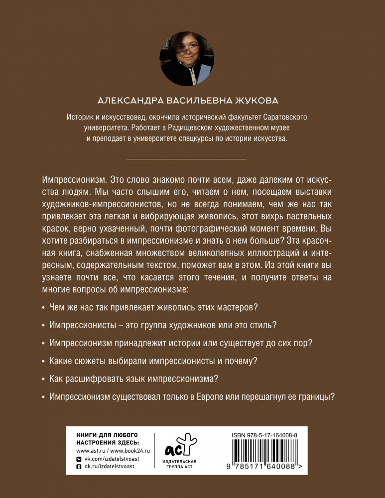 Серия: Искусство понимать Импрессионизм. Это слово знакомо почти всем, даже далеким от искусства людям. Мы часто слышим его, читаем о нем, посещаем выставки художников-импрессионистов, но не всегда понимаем, чем же нас так привлекает эта легкая и вибрирующая живопись, этот вихрь пастельных красок, верно ухваченный, почти фотографический момент времени. Вы хотите разбираться в импрессионизме и знать о нем больше? Эта красочная книга, снабженная множеством великолепных иллюстраций и интересным, содержательным текстом, поможет вам в этом. Давайте всмотримся в картины импрессионистов, узнаем побольше о самих авторах, научимся читать и понимать их живопись. |