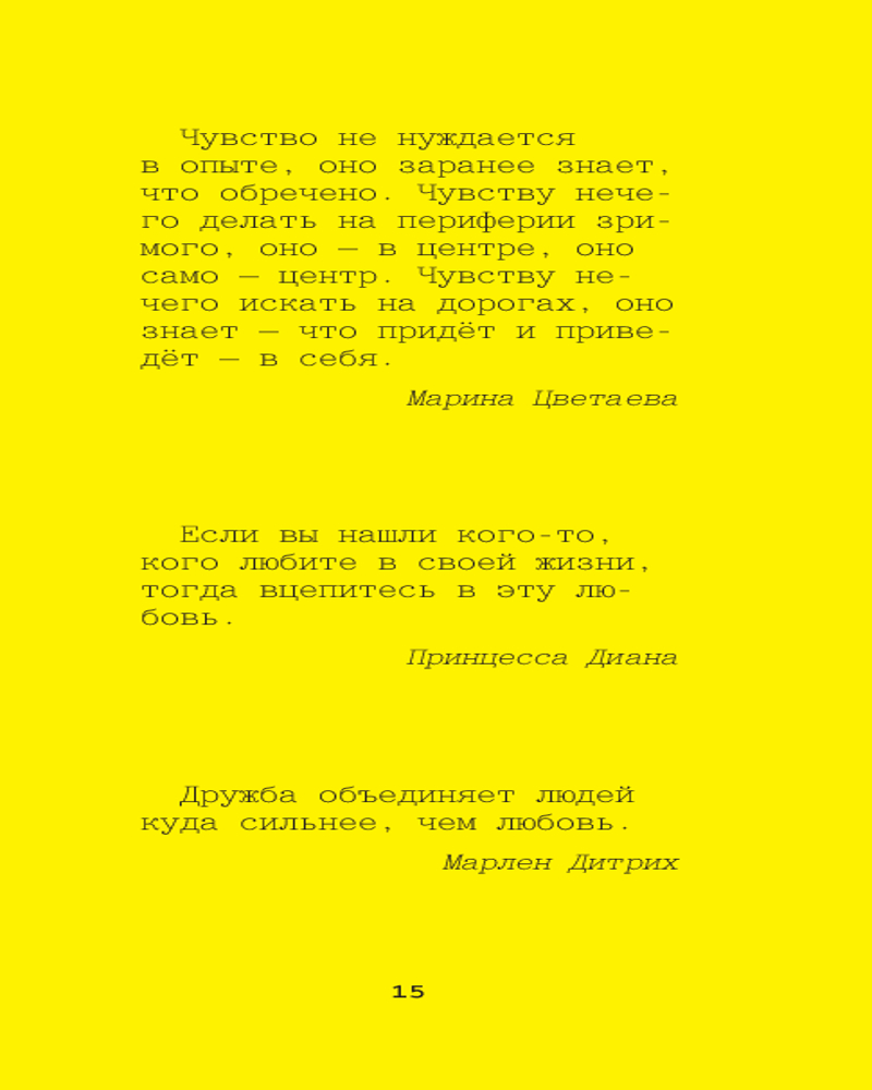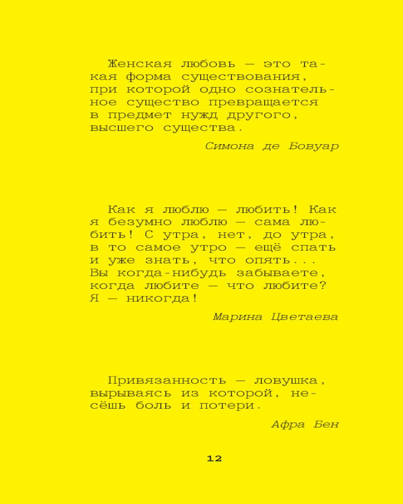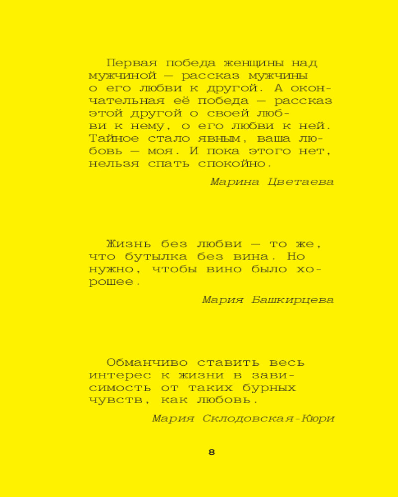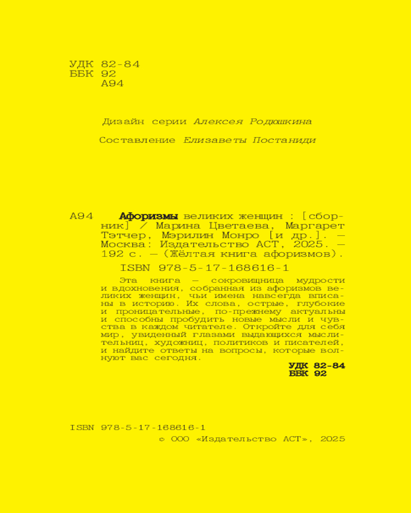 Серия: Жёлтая книга афоризмов Эта книга — сокровищница мудрости и вдохновения, собранная из афоризмов великих женщин, чьи имена навсегда вписаны в историю. Их слова, острые, глубокие и проницательные, по-прежнему актуальны и способны пробудить новые мысли и чувства в каждом читателе. Откройте для себя мир, увиденный глазами выдающихся мыслительниц, художниц, политиков и писателей, и найдите ответы на вопросы, которые волнуют вас сегодня. |