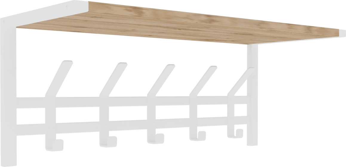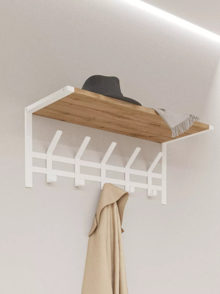 Настенная вешалка с полкой в стиле лофт Торонто 21Д — это идеальное решение для создания функционального пространства в вашей прихожей или гардеробной. Эта модель прекрасно впишется в любой интерьер в стиле лофт, добавляя нотку современности и оригинальности. Она обладает всеми необходимыми качествами для удобного хранения одежды и аксессуаров. На деревянной полке можно разместить головные уборы, шарфы или свои любимые предметы. Это удобное дополнение, которое поможет вам организовать пространство и добавить характер вашему интерьеру. 5 двойных стильных крючков позволят вам подвесить одежду, шапки или сумки, удобно расположив их для быстрого доступа.