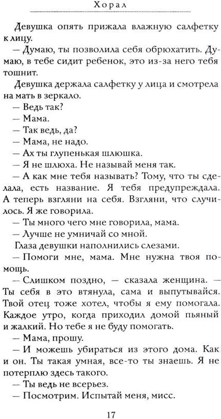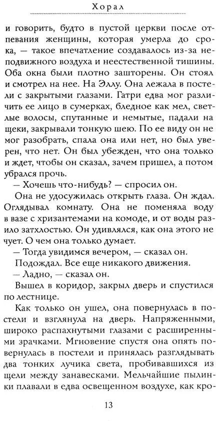 Серия: Особняк: современная классика От школьного учителя Тома Гатри ушла жена, и теперь он один воспитывает двух маленьких сыновей. Виктории Рубидо 17 лет, она беременна и мать выгнала ее из дома. Братья Макфероны — одинокие старики-фермеры. Чудаковатые, невежественные, привыкшие к своим порядкам. Они уверены, что ничего хорошего в их жизни уже не произойдет. Все они живут в маленьком городке, где как будто бы ничего не меняется, и не ждут от жизни чудес, но однажды их судьбы пересекутся и там, где не было ничего кроме тьмы, горя и одиночества, вдруг засияет надежда. «Хорал» — это роман о бытовых чудесах, доброте незнакомцев и невидимых связях, которые между людьми образует сама жизнь, и зачастую эти связи оказываются прочнее кровных. |