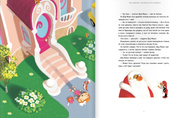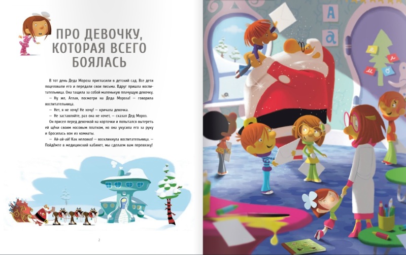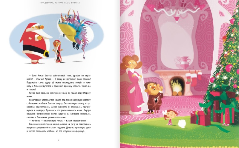 Книга большого формата в твердой картонной обложке - матовой с частичной лакировкой. Страницы офсет, шрифт удобный, четкий. Иллюстрации яркие, компьютерные, но при этом производят хорошее впечатление! Сама книга представляет собой 4 новогодние истории: 1. Девочка Аглая боялась всего на свете. И Дед Мороз решил подарить ей...котенка! Котенок был таким беззащитным и маленьким, что девочка храбро решила впредь заботиться о своем друге и оберегать его от опасностей) 2. Мальчик хотел получить на НГ слово "Да!", а как его сделать? Оказывается, в его семье все были очень заняты и не хотели играть с мальчиком, поэтому на все его просьбы отвечали отказом. А подарили ему...слона!!! Самого настоящего! 3. В семье третьей девочки взрослые постоянно ругались и кричали друг на друга, поэтому ребенок хотел на Новый год скотч! Чтобы заклеить рты, разумеется) Но мудрый Дед Мороз подарил кое-что другое) 4. Что хотеть, когда игрушек полный дом? Еще игрушки! Как искоренить жадность и научить ценить даже малое, вы узнаете, когда прочитаете последнюю историю в книге)