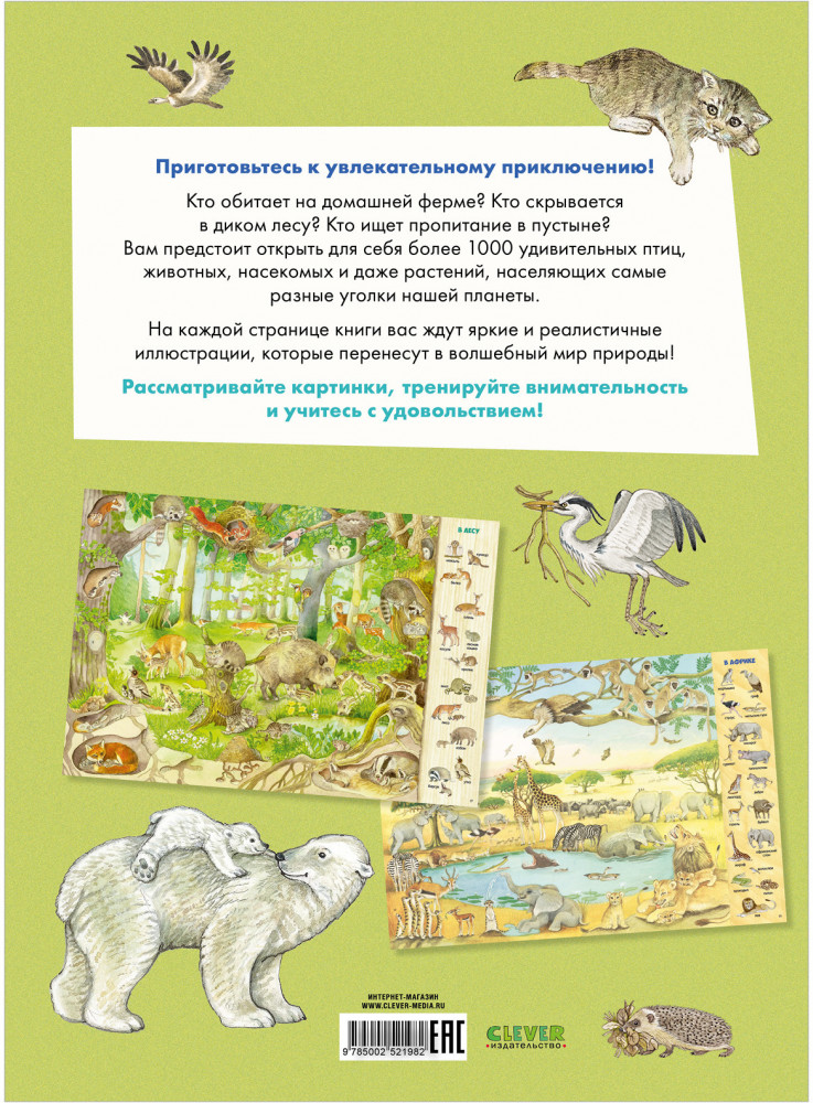 💳 Оплатить за товар можно при получении 🇰🇿 Есть бесплатная доставка по Казахстану 🎁 Копите бонусы с каждой покупки Серия: Найди и покажи «Найди и покажи. 1000 животных» — увлекательная книжка-картинка, каждую страницу которой хочется рассматривать снова и снова. Реалистичные детальные иллюстрации, десятки разворотов и любимая детская игра «найди и покажи» — книга не оставит равнодушным ни одного ребенка и будет интересна ни один год. Кто обитает на домашней ферме? Кто скрывается в диком лесу? Кто ищет пропитание в пустыне? Вам предстоит узнать более 1000 удивительных созданий: птицы, животные, насекомые, растения, населяющие самые разные уголки нашей планеты, ждут маленьких читателей на страницах этой книги для малышей. |