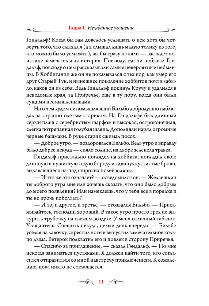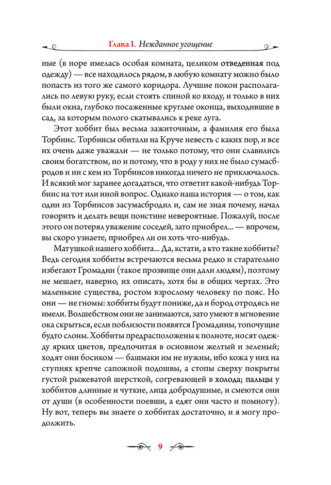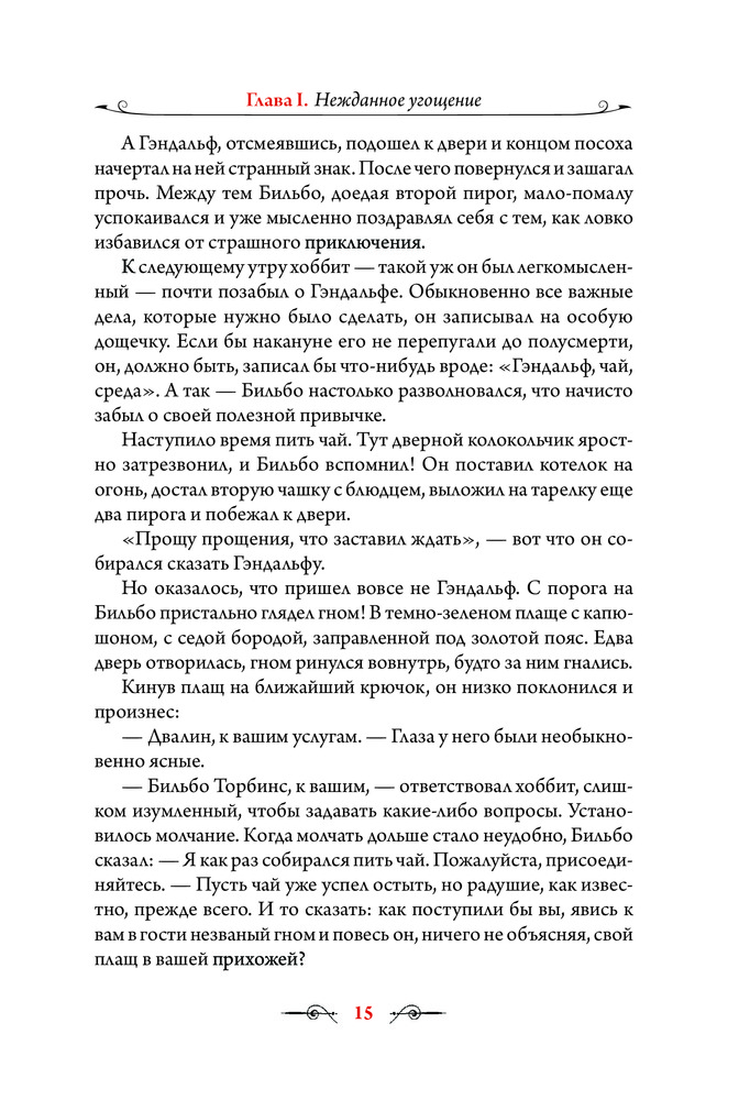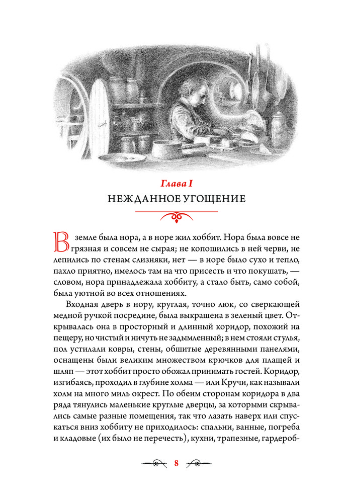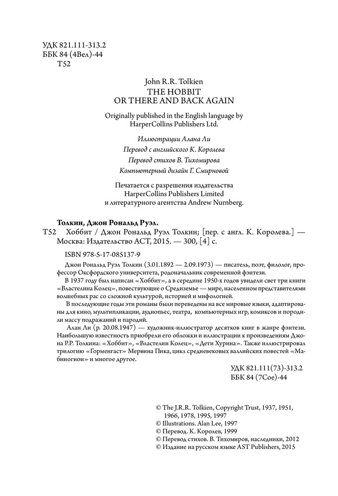Я, будучи поклонницей творчества Толкина, долго ждала книгу с иллюстрациями Алана Ли. И не разочаровалась, рисунки прекрасны. Цветных полностраничных иллюстраций 26, помимо них много не менее красивых карандашных зарисовок. Печать хорошая, бумага мелованная. Перевод Королева (т.е. Торба-на-Круче, Бильбо Торбинс и т.д.). Единственный минус - ужасная, мой на мой субъективный вкус, обложка. Иллюстрация на ней красивая, но блестящее покрытие смотрится кошмарно.