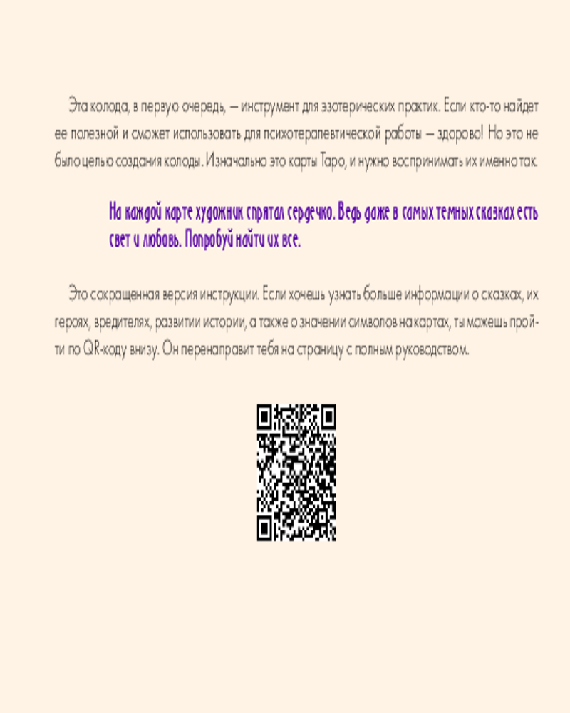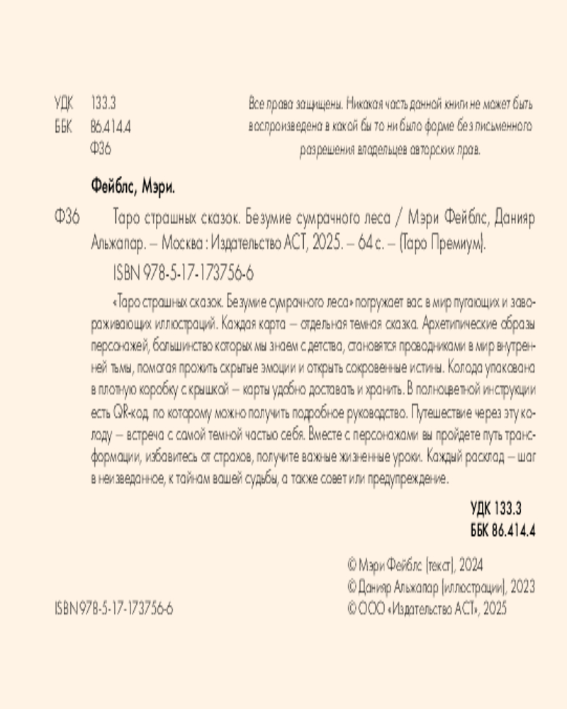 Серия: Таро премиум «Таро страшных сказок. Безумие сумрачного леса» — врата в мир безумных видений и таинственных сил, скрытых за гранью обыденного. Все карты здесь — отражение теней, оживших в дремучем лесу, где логика уступает место интуиции и безумию. Это колода, которая предлагает заглянуть на другую сторону реальности, где ответы надо искать в тенях. Каждая карта — отдельная темная сказка, ведущая к глубокому древнему знанию, скрытому внутри каждого из нас. Образы знакомых с детства персонажей становятся проводниками в мир внутренней тьмы, помогая прожить скрытые эмоции и открыть сокровенные истины. Колода идеально подойдет тем, кто готов к глубокому погружению в мир Судьбы через призму мрачных сказок и загадочных символов. Она для тех, кто не боится заглянуть в тени, встретиться с неведомым и получить важные инсайты. |