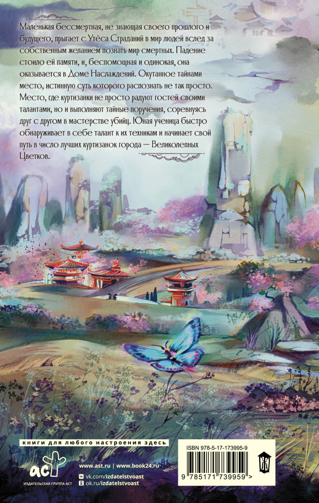 Серия: Мотивы далекой Азии Маленькая бессмертная, не знающая своего прошлого и будущего, прыгает с Утёса Страданий в мир людей вслед за собственным желанием познать мир смертных. Падение стоило ей памяти, и беспомощная и одинокая она оказывается в Доме Наслаждений. Окутанное тайнами место, истинную суть которого распознать не так просто. Место, где куртизанки не просто радуют гостей своими талантами, но и выполняют тайные поручения, соревнуясь друг с другом в мастерстве убийц. Юная ученица быстро обнаруживает в себе талант к их техникам и начинает свой путь в число лучших куртизанок города — Великолепных Цветков. |