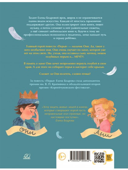 Серия: Фэнтези — класс! Главный герой повести «Перья» — мальчик Онн. Да, такое у него необычное имя. Онн очень скучает по маме, которой уже нет на этом свете. Но, уходя, она оставила сыну легенду, мешок голубиных перьев и... МЕЧТУ. В память о маме Онн хочет непременно вернуть голубей в свои края. А для этого он собирает перья и мастерит себе крылья. Сможет ли Онн взлететь, словно птица? |