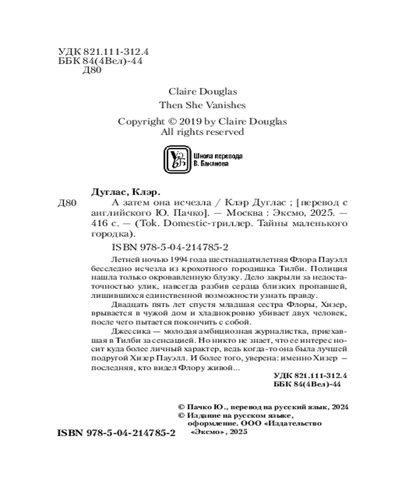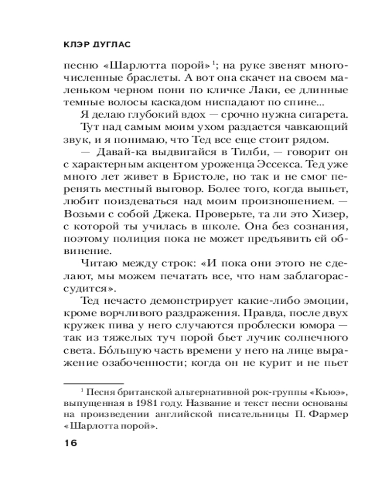 В данный момент этот товар отсутствует в продаже. Возможно, у нас найдется аналогичный или похожий товар здесь. Серия: Tok. Domestic-триллер. Тайны маленького городка (обложка) Летней ночью 1994 года шестнадцатилетняя Флора Пауэлл бесследно исчезла из крохотного городишка Тилби. Полиция нашла только окровавленную блузку. Дело закрыли за недостаточностью улик, навсегда разбив сердца близких пропавшей, лишившихся единственной возможности узнать правду. Двадцать пять лет спустя младшая сестра Флоры, Хизер, врывается в чужой дом и хладнокровно убивает двух человек, после чего пытается покончить с собой. Джессика — молодая амбициозная журналистка, приехавшая в Тилби за сенсацией. Но никто не знает, что ее интерес носит куда более личный характер, ведь когда-то она была лучшей подругой Хизер Пауэлл. Девушка уверена: именно Хизер — последняя, кто видел Флору живой.... |
