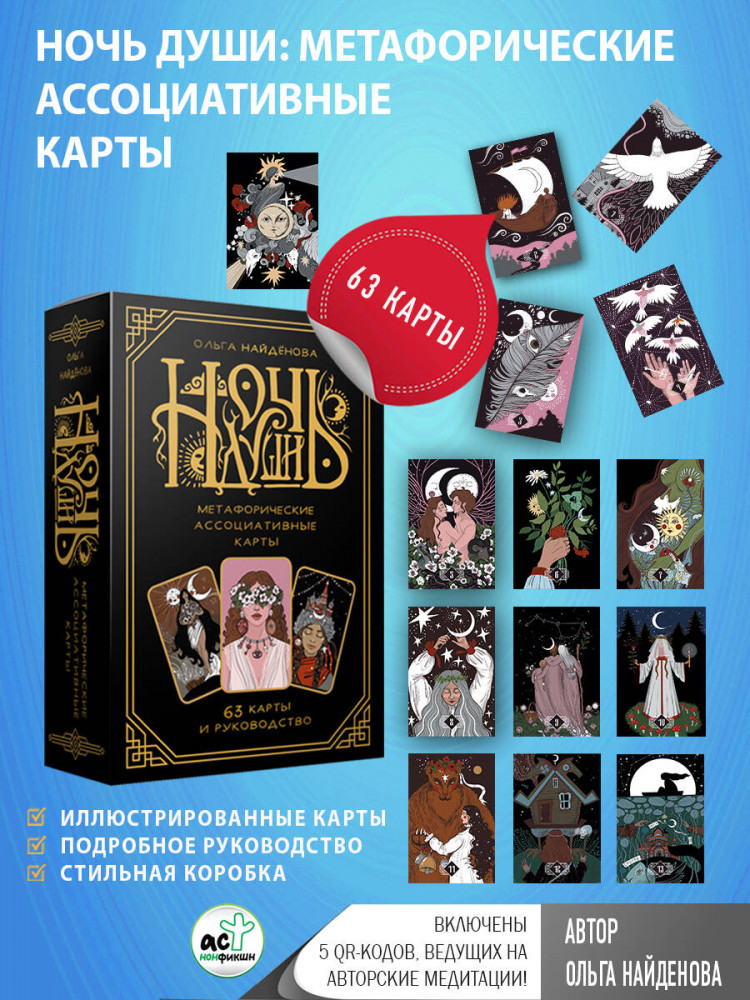 Серия: Метафорические ассоциативные карты: лучшее (Подарочная коробка с картами и книгой) Ольга Найдёнова — психолог, психоаналитик, гипнолог, женский тренер, спикер международного уровня, путешественница по местам силы и ведущая глубинных медитативных практик. Автор книг «Дорога в подсознание», «Пропиши себе успешную судьбу» и «Узор женской силы». Колода «Ночь Души» позволит вам погрузиться в ту бессознательную часть вашей души, что называют ее «темной стороной», пройти Путь Героя из тьмы к свету, встретиться со своими потаенными переживаниями и страхами и перепрожить их. Метафорические карты позволят сделать это бережно по отношению к своей психике и дадут ресурс на знаковые изменения в жизни. |