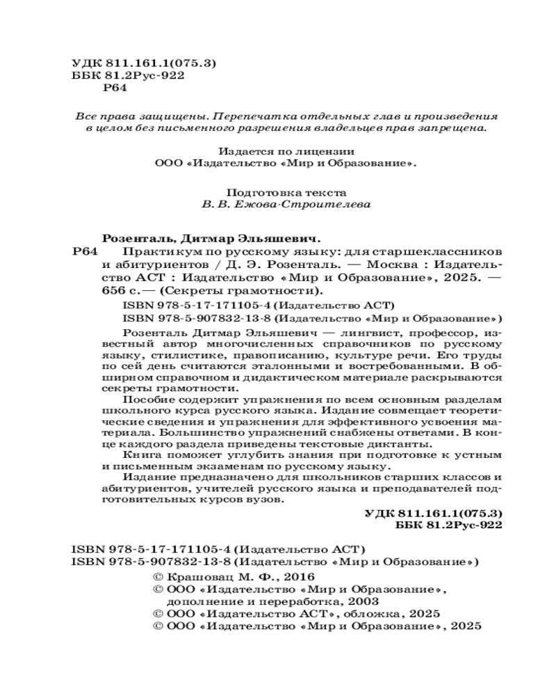 Практикум по русскому языку. Для старшеклассников и абитуриентовВ данный момент этот товар отсутствует в продаже. Возможно, у нас найдется аналогичный или похожий товар здесь. Серия: Секреты грамотности Розенталь Дитмар Эльяшевич — лингвист, профессор, известный автор многочисленных справочников по русскому языку, стилистике, правописанию, культуре речи. Его труды по сей день считаются эталонными и востребованными. В обширном справочном и дидактическом материале раскрываются секреты грамотности. Пособие содержит упражнения по всем основным разделам школьного курса русского языка. Издание совмещает теоретические сведения и упражнения для эффективного усвоения материала. Большинство упражнений снабжены ответами. В конце каждого раздела приведены текстовые диктанты. |