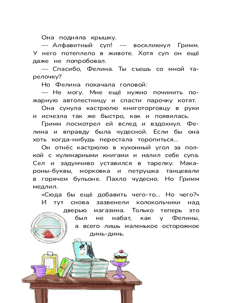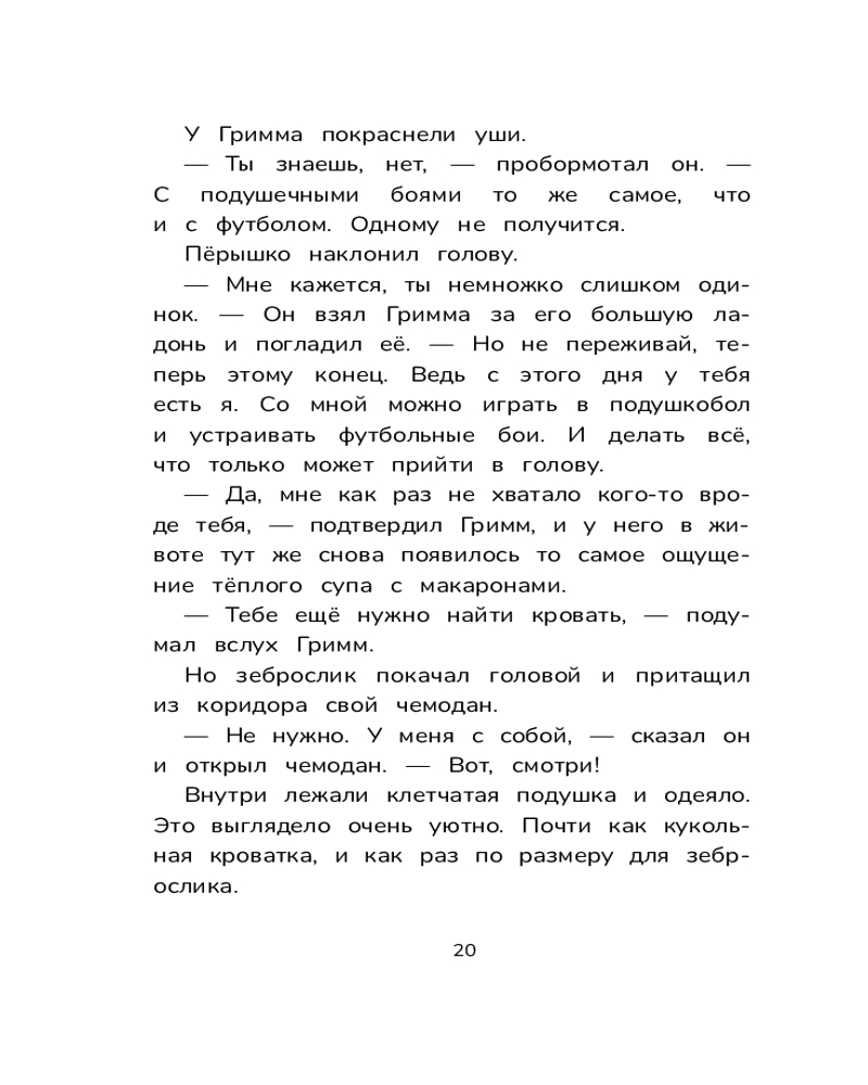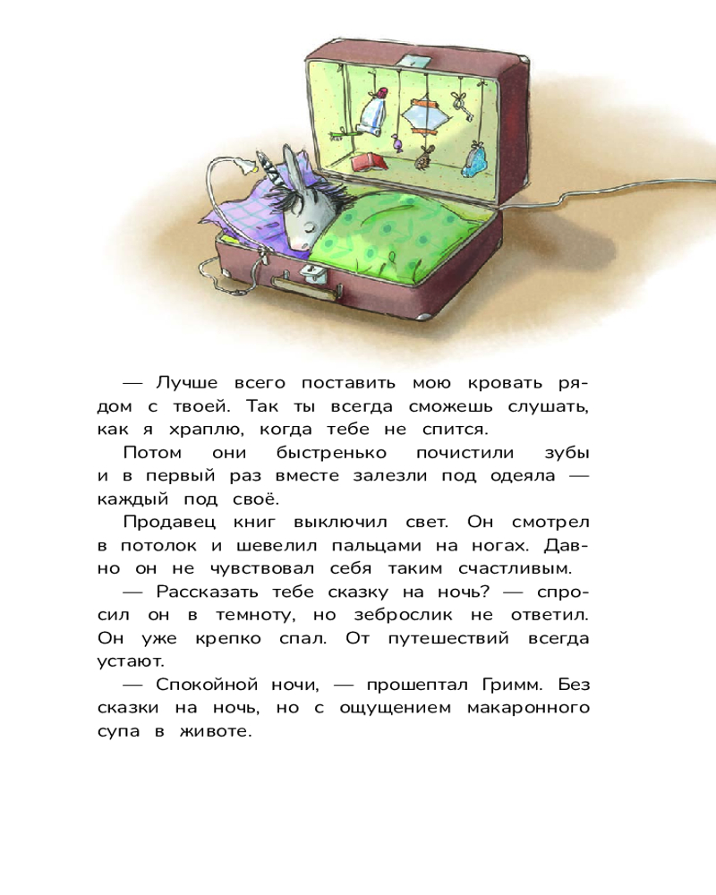 Серия: Детская художественная литература Книготорговец Гримм любит свою небольшую книжную лавку на деревенской площади. Правда, иногда ему бывает грустно и одиноко. Всё мгновенно меняется, когда однажды в уютном магазинчике появляется маленький зеброслик по имени Пёрышко. Зеброслик — это немножко осёл и немножко зебра. Чуть-чуть от каждого, и от обоих самое лучшее. Недолго думая, новый гость решает остаться жить у Гримма. Каждый день с героями случаются новые удивительные истории, и дом книготорговца с кривой семёркой наполняется радостью, приключениями и счастьем. Эта добрая, остроумная и захватывающая книга понравится даже самому привередливому читателю. |