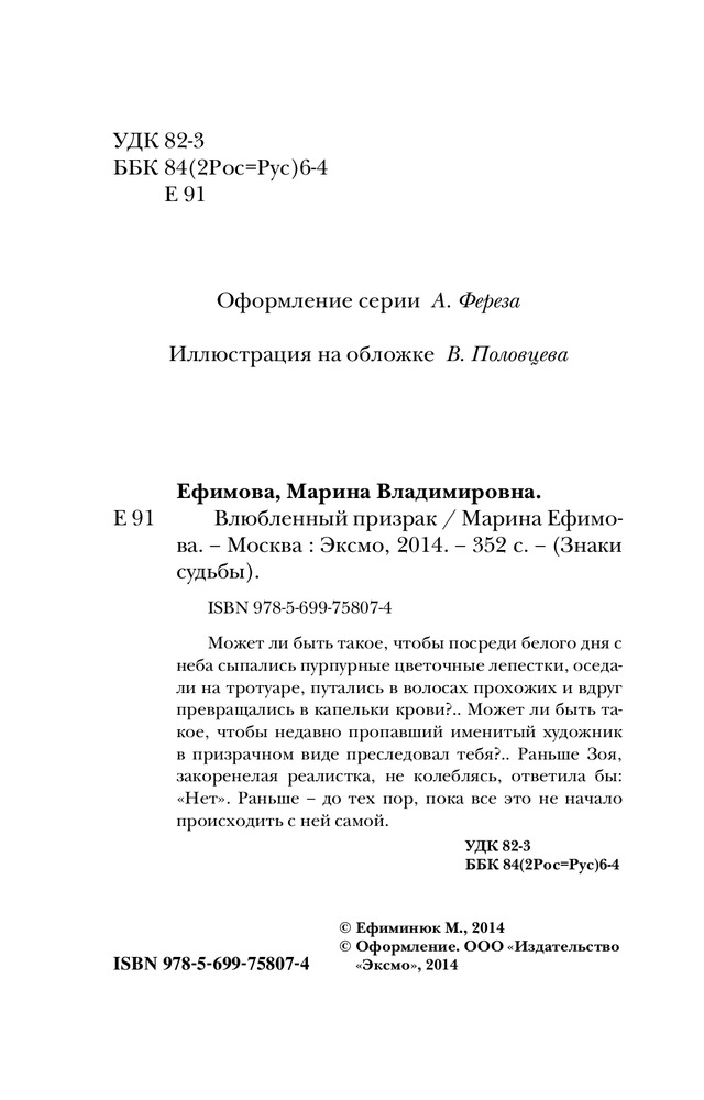 Влюбленный призракВ данный момент этот товар отсутствует в продаже. Возможно, у нас найдется аналогичный или похожий товар здесь. Серия: Знаки судьбы Может ли быть такое, чтобы посреди белого дня с неба сыпались пурпурные цветочные лепестки, оседали на тротуаре, путались в волосах прохожих и вдруг превращались в капельки крови? Может ли быть такое, чтобы недавно пропавший именитый художник в призрачном виде преследовал тебя? Раньше Зоя, закоренелая реалистка, не колеблясь, ответила бы: «Нет». Раньше – до тех пор, пока все это не начало происходить с ней самой. |