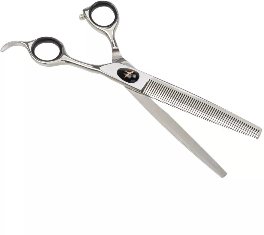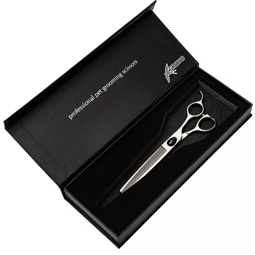 Grodo Ножницы для груминга филировочные с большим черным винтом 7" 56T «Silk Slice»В данный момент этот товар отсутствует в продаже. Возможно, у нас найдется аналогичный или похожий товар здесь. Ножницы предназначены для выполнения профессиональной филировки. Структура шерстяного покрова вашего питомца отличается от человеческих волос, поэтому и были созданы профессиональные ножницы для стрижки животных. Ножницы разработаны для профессионального ухода за шерстью животных как в груминг-салоне, так и дома. Отлично справляются со своей непосредственной задачей, они не оказывают излишнего давления на пальцы, дают возможность работать в течение самого длительного времени. Сделаны из нержавеющей стали.   |