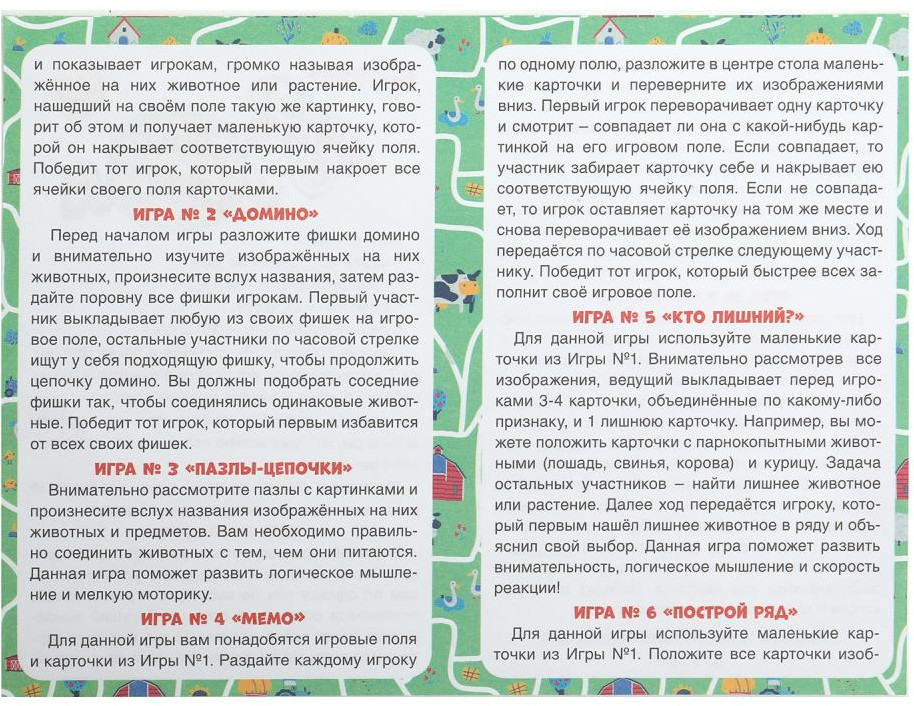 Обучающая игра 7 в 1 «Суперферма» ТМ «Умные игры» — отличный подарок для маленького любознайки. Набор состоит из 7 замечательных игр, которые помогут ребёнку быстро и весело выучить животных фермы, овощи и ягоды. Все варианты игры подробно описаны в инструкции, которая идёт в комплекте. |