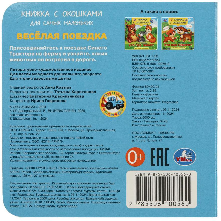 Книжка с окошками «Синий Трактор. Весёлая поездка» ТМ «УМка» станет прекрасным подарком для самых маленьких поклонников мультсериала про приключения весёлого Трактора: