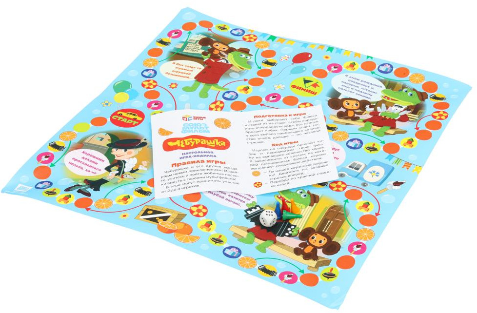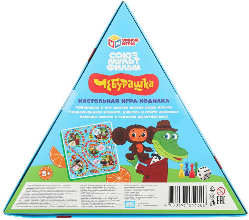 Серия: Союзмультфильм Настольная игра в треугольной коробке «Союзмультфильм. Чебурашка» ТМ «Умные игры» приглашает отправиться навстречу приключениям вместе с любимыми героями! Чебурашка и его друзья всегда рады новым приключениям! Играйте, учитесь и пойте любимые песенки вместе с героями мультфильма! Чтобы определить очерёдность хода, игроки бросают кубик. Первым ходит тот, у кого выпало наибольшее количество очков, далее — по часовой стрелке. |