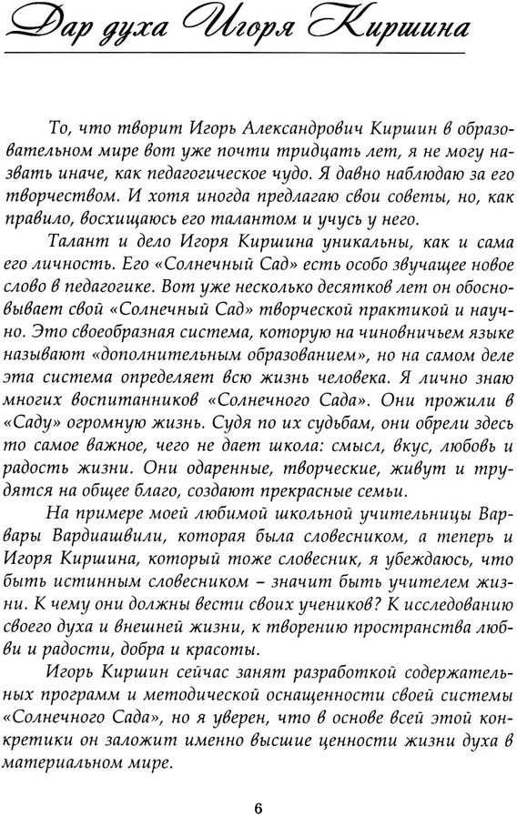 Игорь Киршин — Рыцарь гуманной педагогики, кандидат педагогических наук, преподаватель словесного творчества. В течении тридцати шести лет возглавляет известную студию «Солнечный Сад» в Калининграде. В книге описывается история развития студии в ярких художественных зарисовках: дружба с детьми и конфликты с ними, проблемы детей и сложности их взросления. Это книга о любви к детству. |