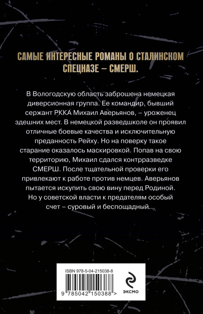 Серия: Солдаты СМЕРШ. Романы о неизвестных боях. Новое оформление (обложка) В Вологодскую область заброшена немецкая диверсионная группа. Ее командир, бывший сержант РККА Михаил Аверьянов, — уроженец здешних мест. В немецкой разведшколе он проявил отличные боевые качества и исключительную преданность Рейху. Но на поверку такое старание оказалось маскировкой. Попав на свою территорию, Михаил сдался контрразведке СМЕРШа. После тщательной проверки его привлекают к работе против немцев. Аверьянов пытается искупить свою вину перед Родиной. Но у советской власти к предателям особый счет — суровый и беспощадный... |