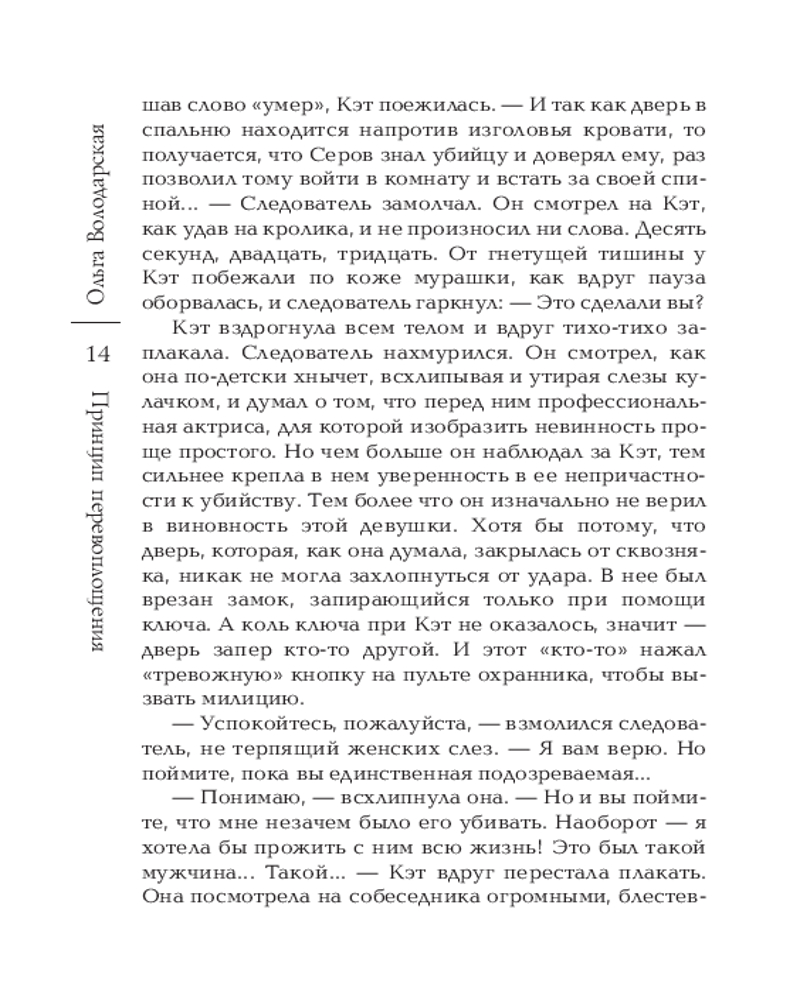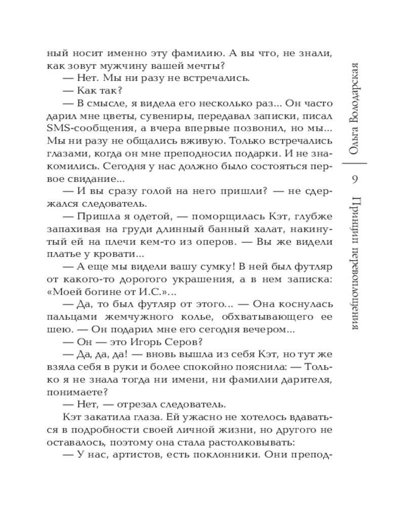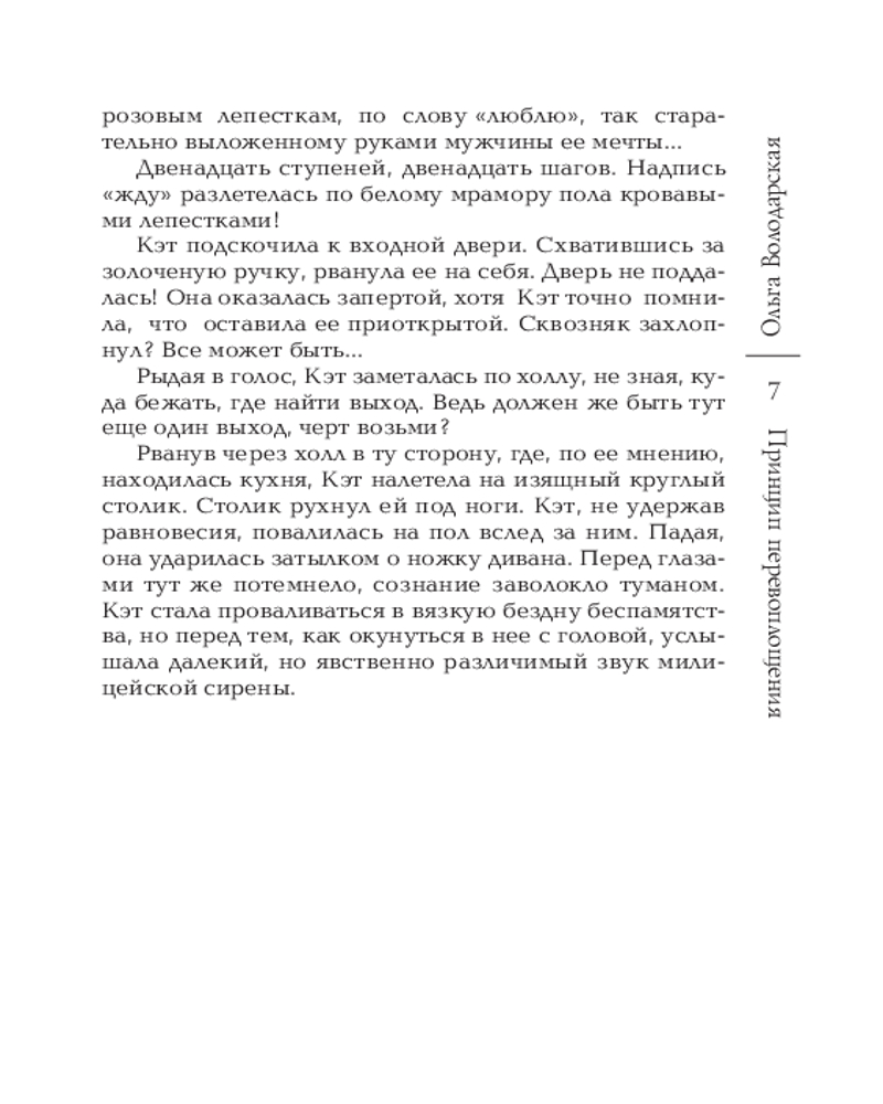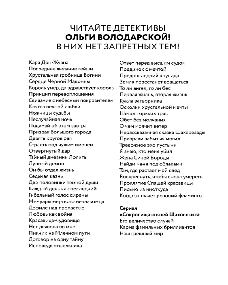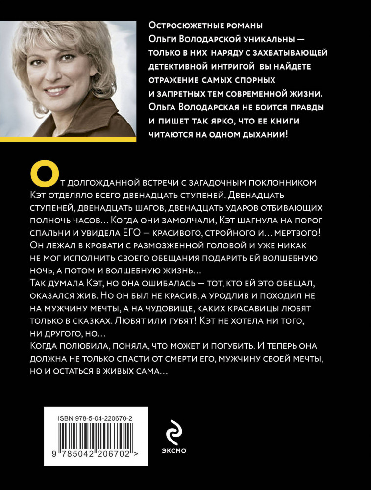 Серия: Никаких запретных тем! Остросюжетная проза О. Володарской. Новое оформление (обложка) От долгожданной встречи с загадочным поклонником Кэт отделяло всего двенадцать ступеней. Двенадцать ступеней, двенадцать шагов, двенадцать ударов отбивающих полночь часов... Когда они замолчали, Кэт шагнула на порог спальни и увидела ЕГО — красивого, стройного и... мертвого! Он лежал в кровати с размозженной головой и уже никак не мог исполнить своего обещания подарить ей волшебную ночь, а потом и волшебную жизнь... Так думала Кэт, но она ошибалась — тот, кто ей это обещал, оказался жив. Но он был не красив, а уродлив, и походил не на мужчину мечты, а на чудовище, каких красавицы любят только в сказках. Любят или губят! Кэт не хотела ни того, ни другого, но... Когда полюбила, поняла, что может и погубить. И теперь она должна не только спасти от смерти его, мужчину своей мечты, но и остаться в живых сама... |