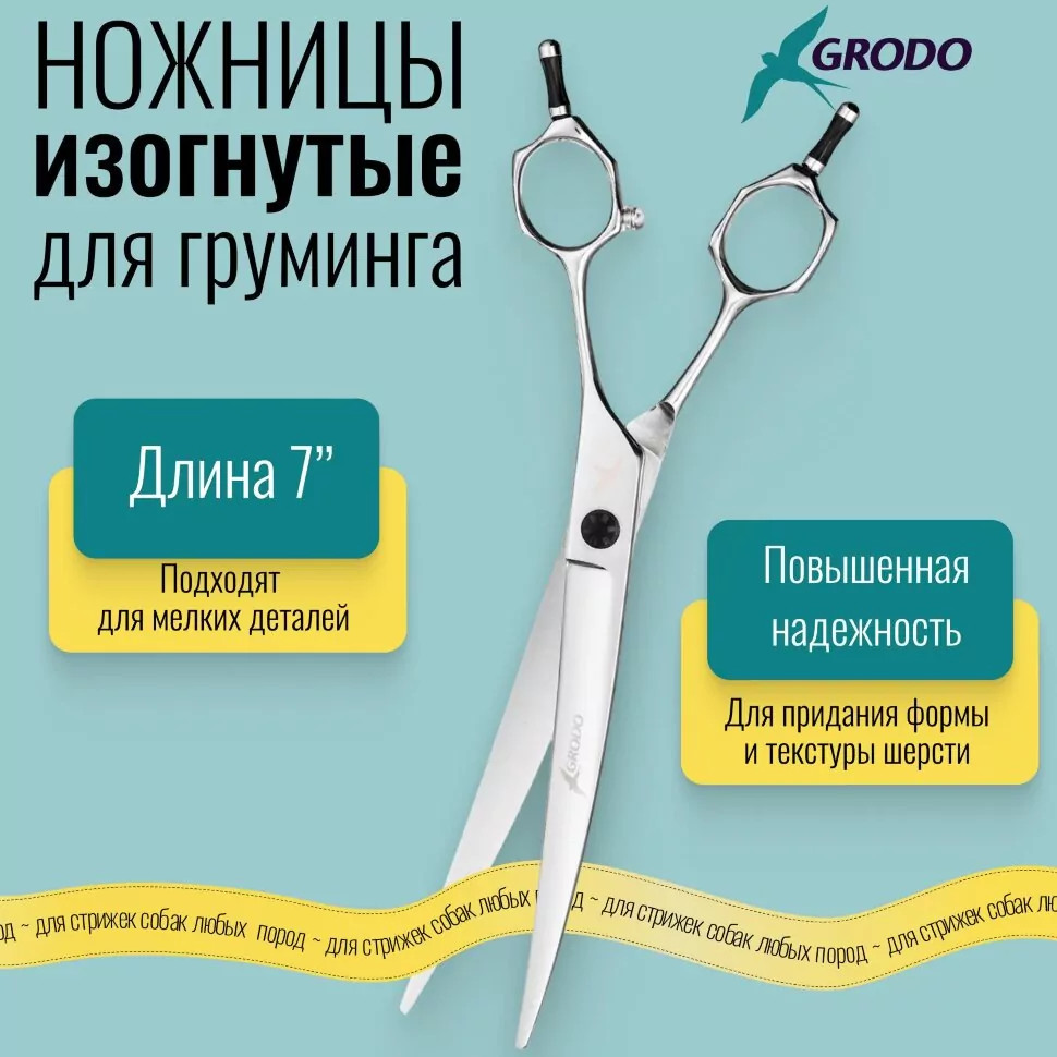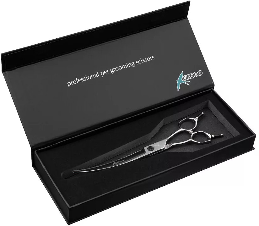 Профессиональные ножницы Grodo CU-70 One для особых стрижек с изогнутым профилем. Инструмент имеет загнутый край лезвия, причем угол наклона может быть разным. Такие ножницы отлично подходят для проработки труднодоступных мест в области лап и морды, состригания шерсти на ушах, формирование креативных стрижек. Чтобы сделать стрижку собаки или кота легкой и быстрой, необходимо применять специальные ножницы. Структура шерстяного покрова вашего питомца отличается от человеческих волос, поэтому и были созданы профессиональные ножницы для стрижки животных.