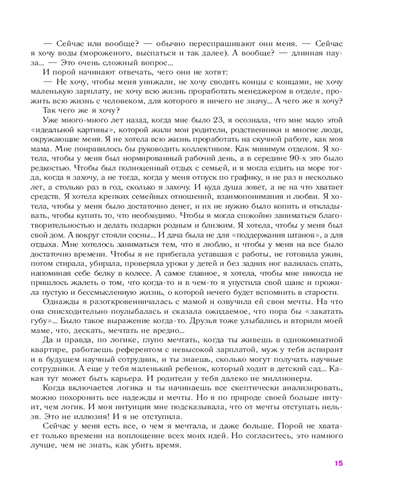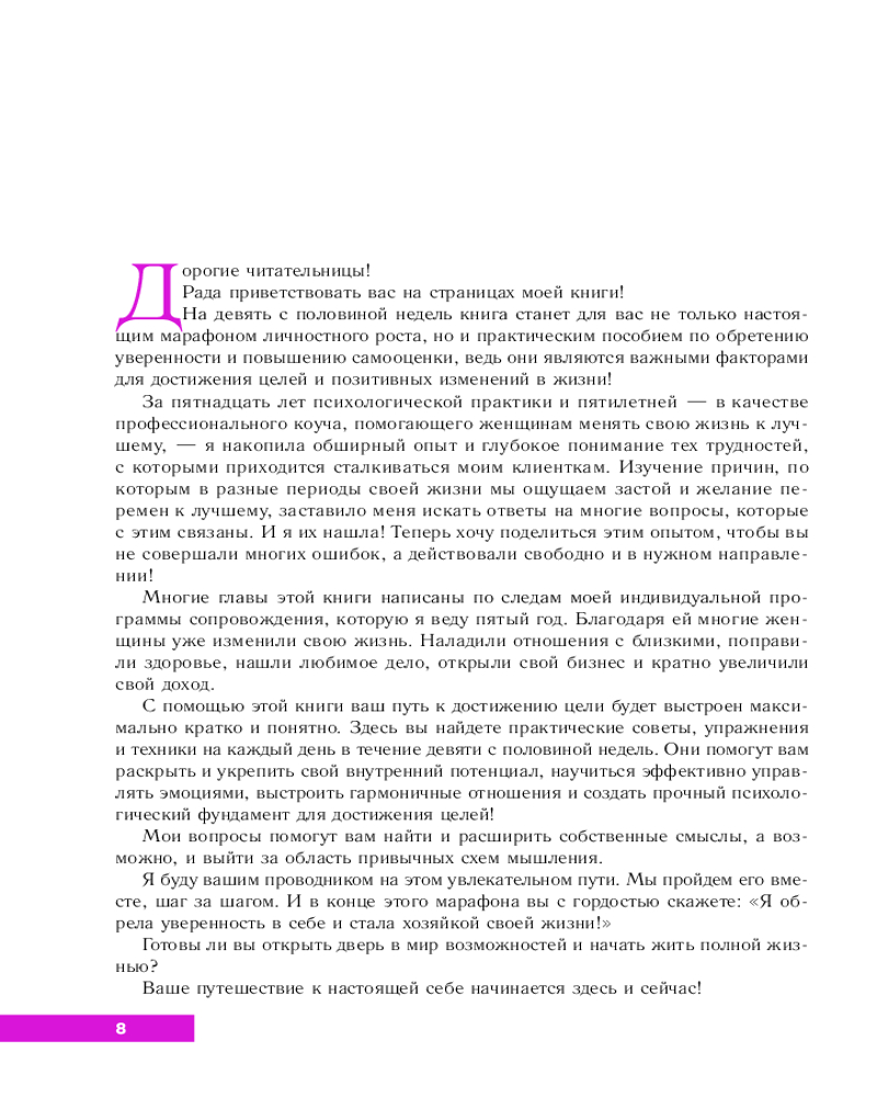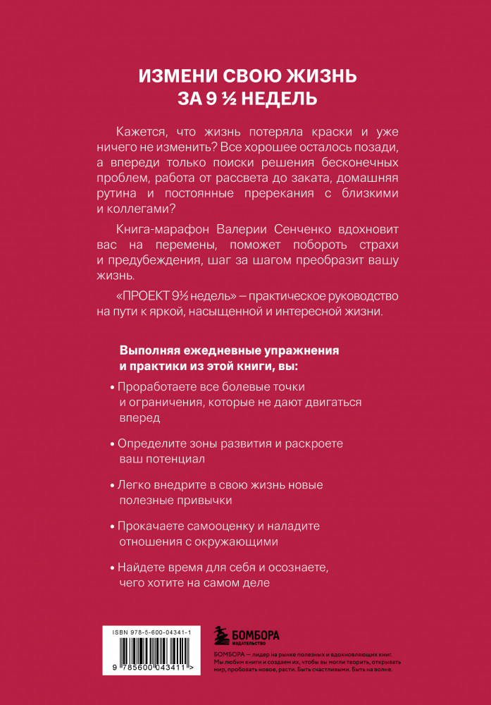 Серия: Психологический бестселлер Кажется, что всё хорошее позади, а впереди только поиски решения бесконечных проблем, работа от рассвета до заката, домашняя рутина и постоянные пререкания с домашними? Книга-тренинг Валерии Сенченко поможет увидеть свет в конце тоннеля, вдохновит на перемены, шаг за шагом преобразит вашу жизнь. Проект «9 ½ недель» — практическое руководство на пути к яркой, насыщенной и интересной жизни. |