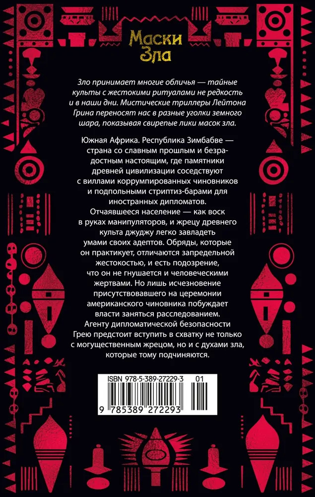 Серия: Маски зла Первая книга остросюжетного цикла, посвященного тандему бывшего морпеха Доминика Грея и профессора феноменологии Виктора Радека, которые вместе берутся за самые запутанные и опасные дела.Во время тайной религиозной церемонии в отдаленной провинции Зимбабве на глазах у сотен зрителей бесследно исчезает американский дипломат. Специальному агенту Грею поручено расследование этого дела. Он — человек, не склонный к мистике и вере в сверхъестественное, но как объяснить произошедшее с рациональной точки зрения? Чем больше Грей ездит по стране и общается с разными людьми, тем яснее становится, что ему пришлось столкнуться с кровавым культом, корни которого уходят в глубину веков и в самые темные и неизведанные уголки Африки. Верховный жрец Н’анга не остановится ни перед чем, чтобы добиться своих целей, — любого, кто станет у него на пути, ждет мучительная смерть. |