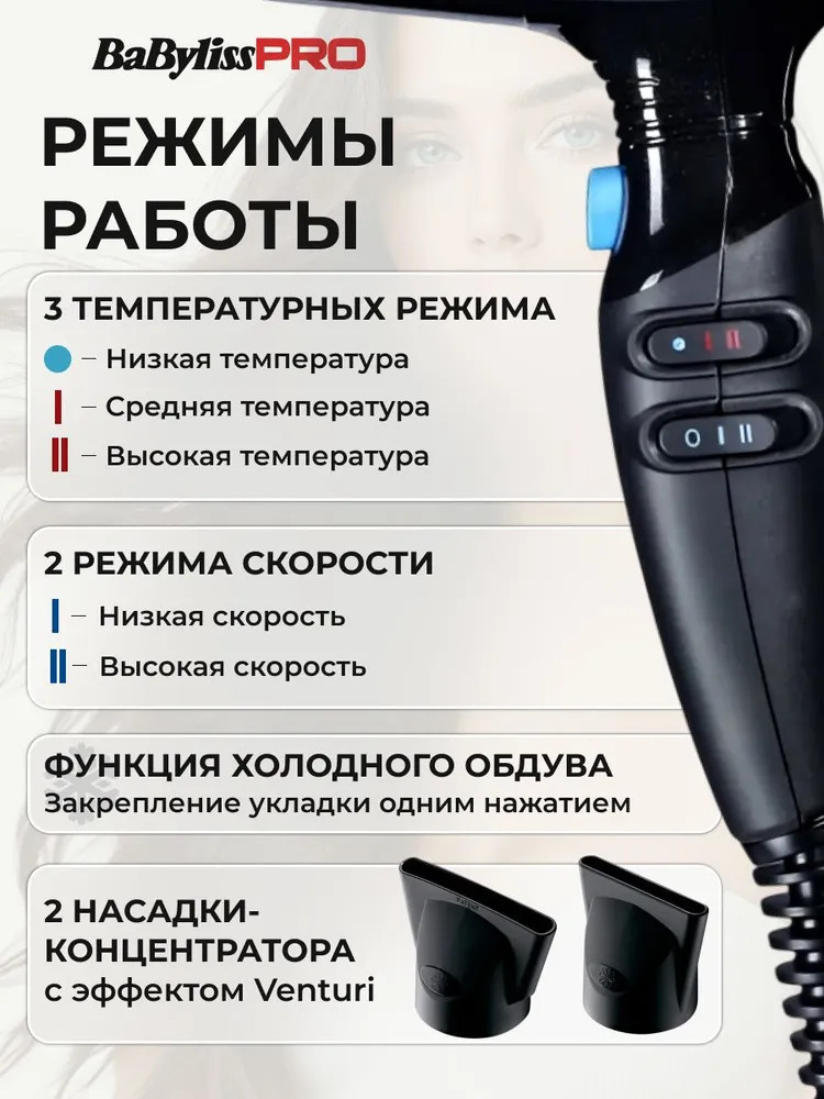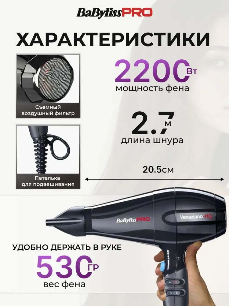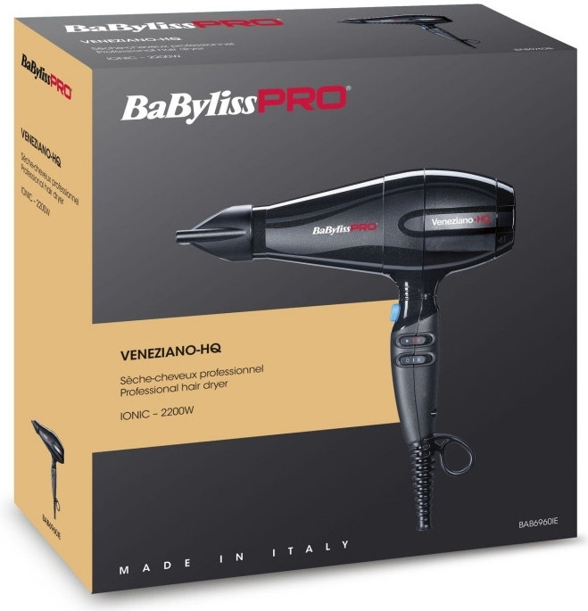 BaByliss PRO BAB6960IE Veneziano-HQ — профессиональный фен для волос от итальянского бренда. Представляет собой улучшенную модель надежного фена BaByliss PRO BAB6610INE Veneziano Ionic. Новая модель фена обладает непревзойдённым техническим оснащением, среди которого выделяется, прежде всего, АС-мотор, позволяющий создавать воздушный поток объёмом 73 м3/ч, давлением 1192 Паскаль и выпускать его со скоростью 161 км/ч. Благодаря такому мотору, фен прослужит дольше, чем все аналогичные приборы, а также будет выполнять высококачественную скоростную сушку, экономя электроэнергию. Вы сможете сами контролировать нагревание фена с помощью целых шести режимов, что позволит добиться великолепной укладки, долго сохраняющей свой изначальный вид и устойчивой к влажности. Фен будет комфортно располагаться в руке, и благодаря его маленькому весу, ваше запястье не устанет во время использования.