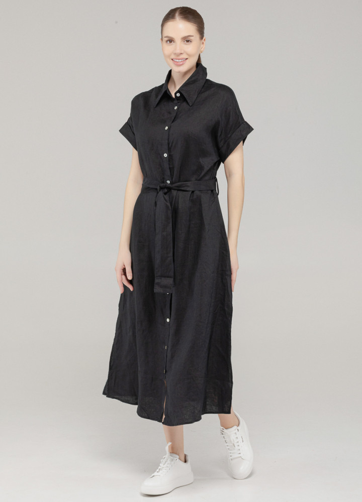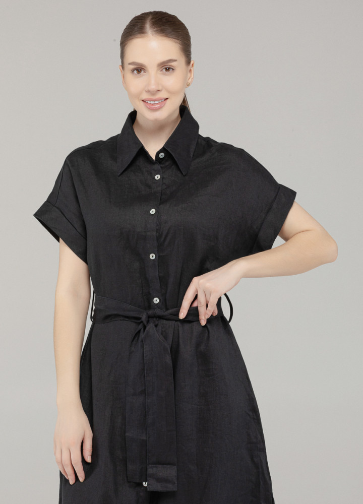 Платье-рубашка — воплощение минималистичного летнего стиля. Выполнено из чистого льна, оно отлично дышит и дарит ощущение лёгкости в жаркие дни. Чёрный цвет делает образ строгим, но универсальным: подойдёт как для офиса, так и для прогулки по городу. Прямой силуэт с поясом подчёркивает фигуру, а аккуратный воротник добавляет изысканности. Это платье — база, которая легко впишется в любой гардероб.