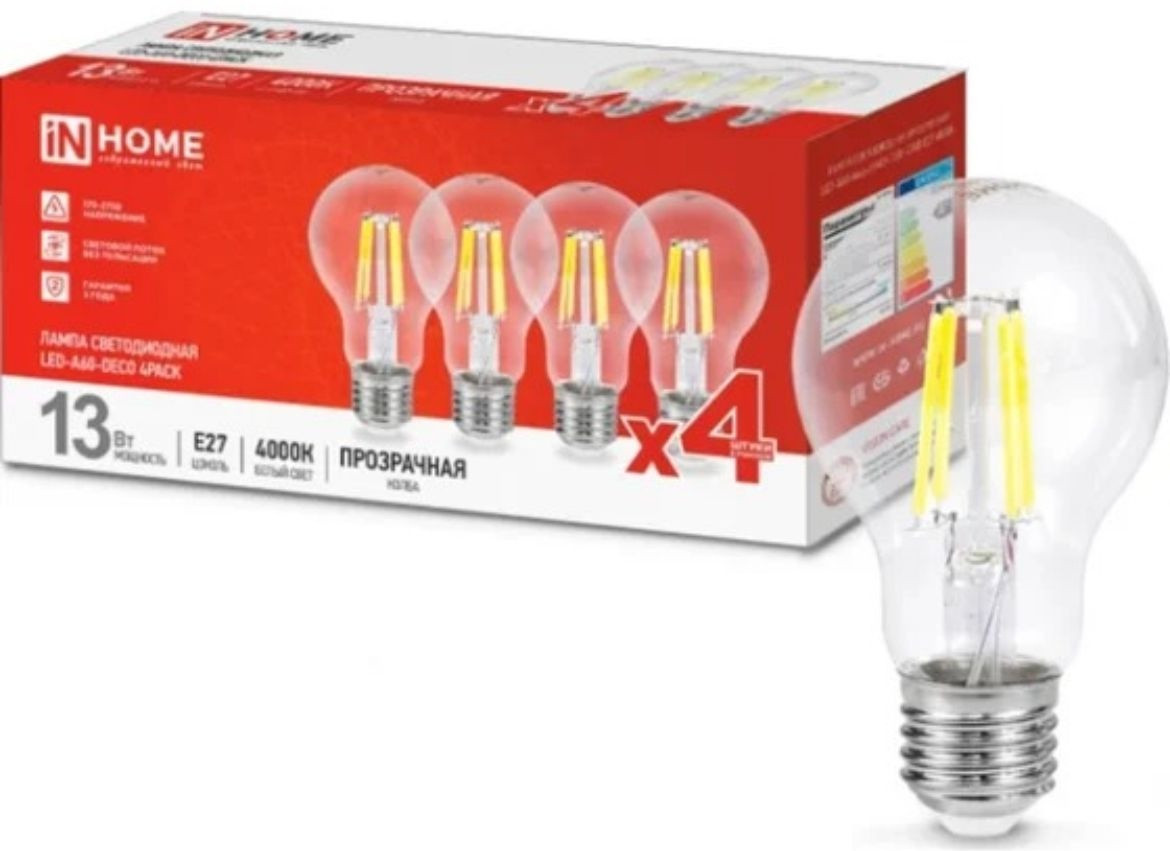 Они состоят из прозрачной стеклянной колбы, цоколя и светодиодных филаментных нитей (дословно Filament переводится - нить накала). Лампа LED-A60-deco ТМ IN HOME представляет собой инновационный. экономичный и экологически безопасный источник света, в котором светообразующим элементом является диод.