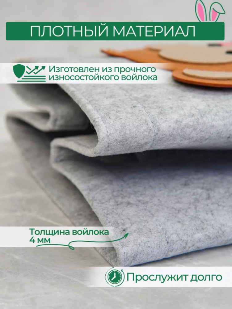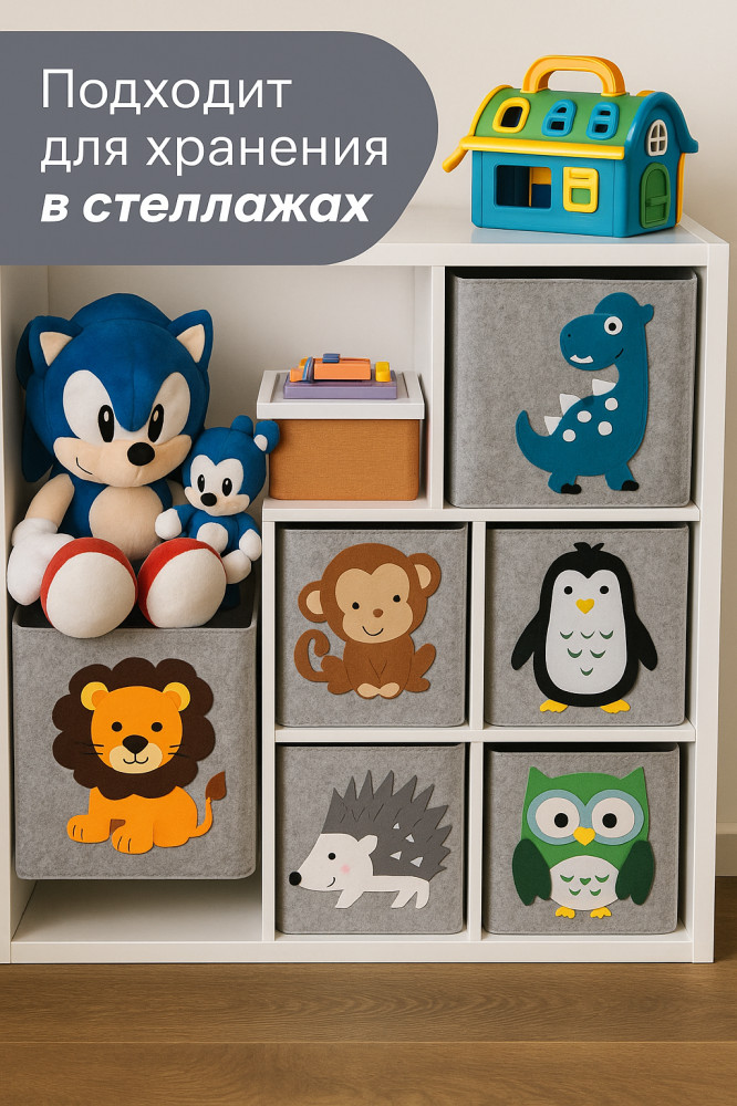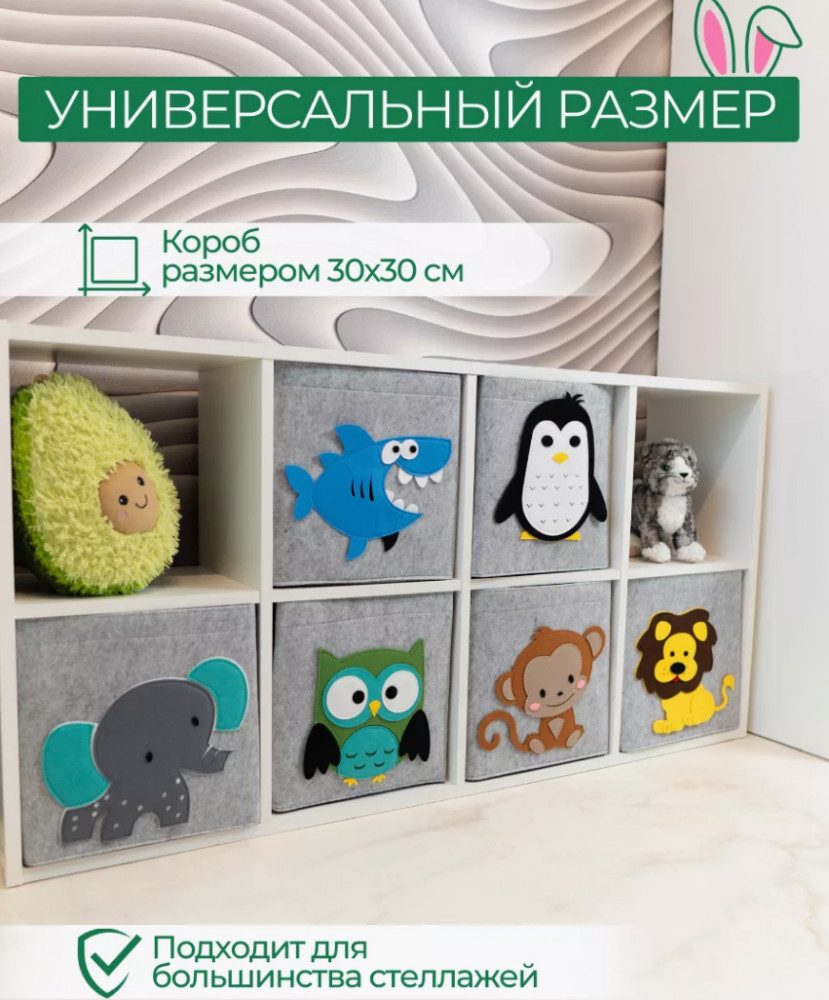 Набор корзин из войлока «Зоопарк» — яркое решение для вашего дома! Превратите хранение в удовольствие с набором из 4 корзин «Зоопарк»! Эти стильные и практичные корзины изготовлены из плотного фетра толщиной 4 мм, который держит форму, не впитывает запахи и не боится воды. Универсальный размер (30×30×30 см) позволяет удобно разместить корзины в любой комнате: от детской до гостиной.