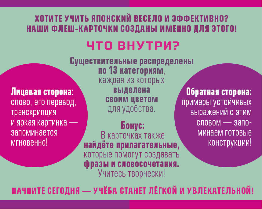 Серия: Флеш-карточки для изучения иностранного языка Хотите учить японский весело и эффективно? Тогда без флеш-карточек вам не обойтись! На лицевой стороне вы найдете японское слово, его перевод, транскрипцию слоговой азбукой кана и яркую картинку для упрощения запоминания. На обратной стороне — примеры употребления. Таким образом, вы не просто заучите слово, но и сможете использовать его в речи. Слова разделены на 13 категорий, каждая из которых выделена своим цветом. Флеш-карточки подойдут взрослым и детям, заинтересованным в изучении японского языка. |