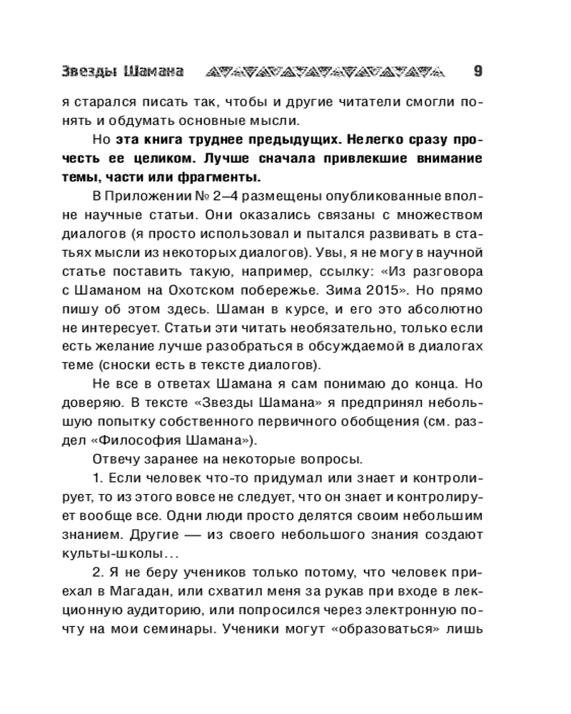 Шаман очень много лет живет один в зоне вечной мерзлоты без всякой поддержки социума. В то же время он «патологически здоров», практичен и рационален, периодически бывает в городах с целью освоения новых отношений, практик и инструментария развивающегося общества. Многие его размышления и советы поражают парадоксальностью, однако часто помогают изменить свою жизнь в сторону большей духовности, смысла, человечности, здоровья, организованности и обеспеченности. |