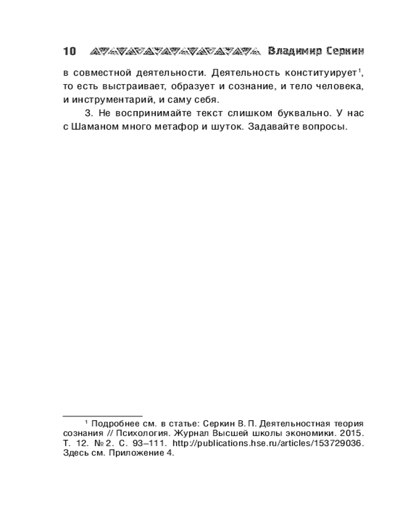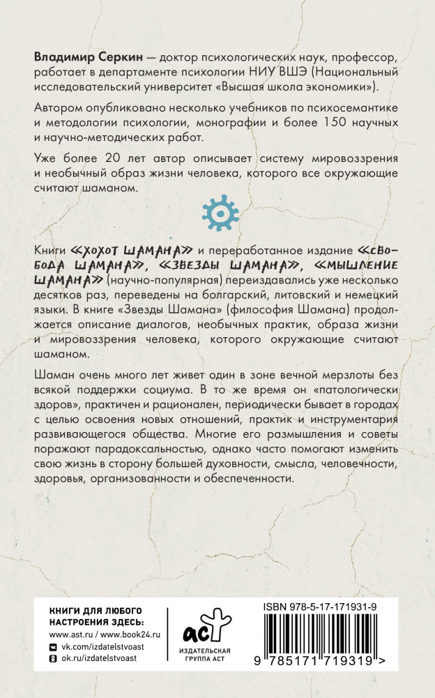 Серия: Философия шамана Владимир Серкин, профессор, доктор психологических наук, 24 года работал в Северо-Восточном государственном университете (Магадан). С 2011 года — профессор департамента психологии «Высшей школы экономики» (Москва). Опубликовано более 150 научных работ, в том числе несколько монографий, учебники по психосемантике и методологии психологии.