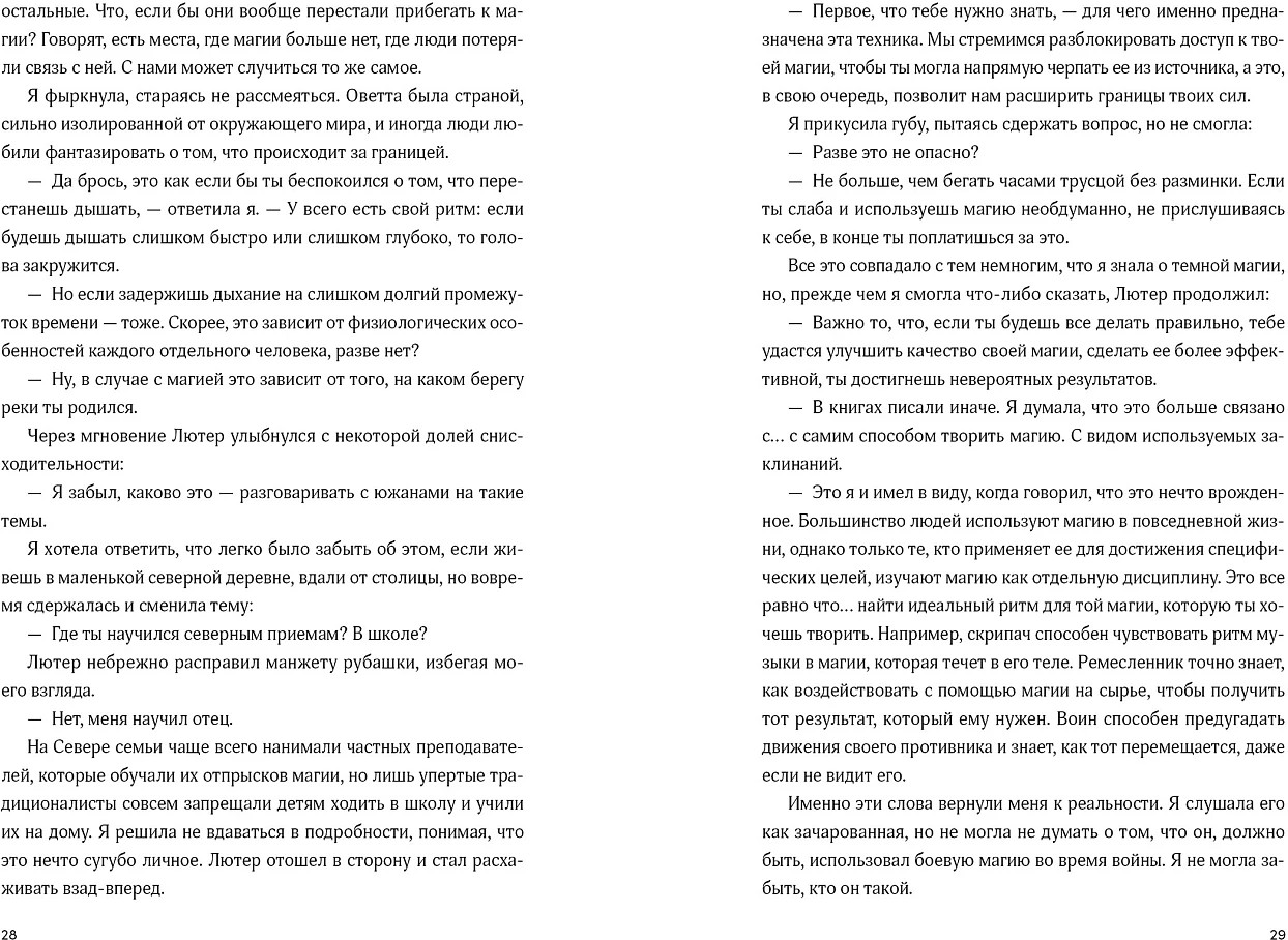 Страна Оветта разделена на две непримиримые части. Юг почитает магию как природный дар и призывает обращаться с ней бережно. Север, напротив, настаивает на неограниченной свободе магических практик, включая самые опасные. Дочь северянки и южанина Айлин Данн везде чувствует себя чужой, но не примыкает ни к одной из сторон. Стремясь завершить диссертацию, девушка обращается за помощью к Лютеру Муру — скандально известному северянину, изгнанному со двора. Его пристрастие к темной магии отталкивает Айлин, но чем ближе она знакомится с Муром, тем сильнее размывается грань между допустимым и запретным. Когда занятия с Лютером приносят первые результаты, девушка узнает тайну, грозящую разжечь войну. Перед Айлин встает нелегкий выбор: кому доверять и как сохранить хрупкий мир? |