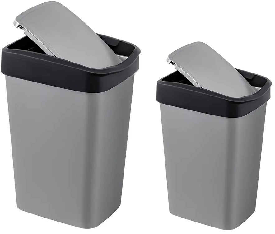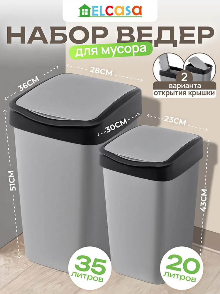 Набор 2 вёдер для мусора от бренда El Casa с подвижными крышками поможет поддерживать чистоту в вашем доме, офисе или на улице. Каждое мусорное ведро прямоугольной формы выполнено из полипропилена. Этот вид пластика считается наиболее безопасным, так как не содержит бисфенол А и не выделяет вредных веществ. Дизайн представляет собой стильное сочетание белого и серого цветов.