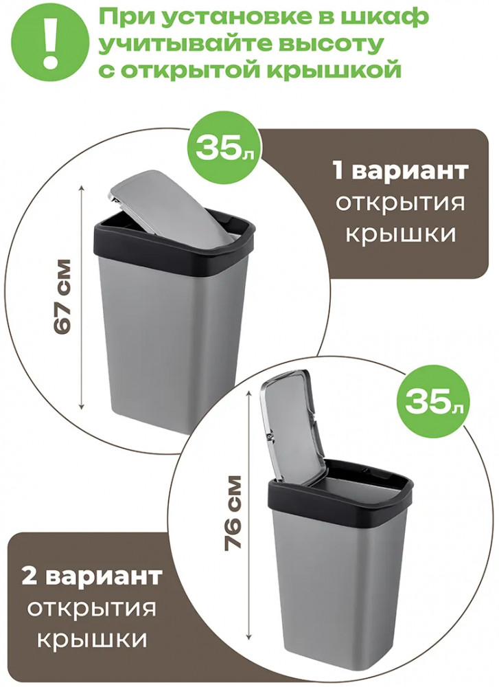 • ведро с подвижной крышкой 36×28×51 см на 35 литров (размер без крышки 34×26,5×45,7 см, размер дна 28×21,5 см) — 1 шт.