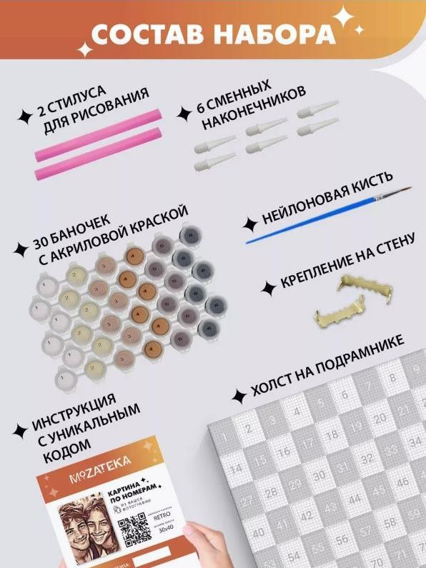 iLikeGift Картина по номерам по фото «Retro»В данный момент этот товар отсутствует в продаже. Возможно, у нас найдется аналогичный или похожий товар здесь. Набор «Картина по номерам по фото» — идеальный способ создать уникальное произведение искусства своими руками! Просто загрузите свое фото, и вы получите персонализированную схему для холста, чтобы нарисовать картину по-пиксельно. Набор состоит из холста на подрамнике размером 30×40 см с графической схемой для рисования, набора акриловых красок, ручки-стилуса, кисточки, крепления и инструкции с уникальным кодом. Создание картины не требует смешивания красок. Картина по номерам по порадует как взрослого, так и ребенка, станет прекрасным подарком или украшением вашего интерьера. Упакован в картонную коробку.  |