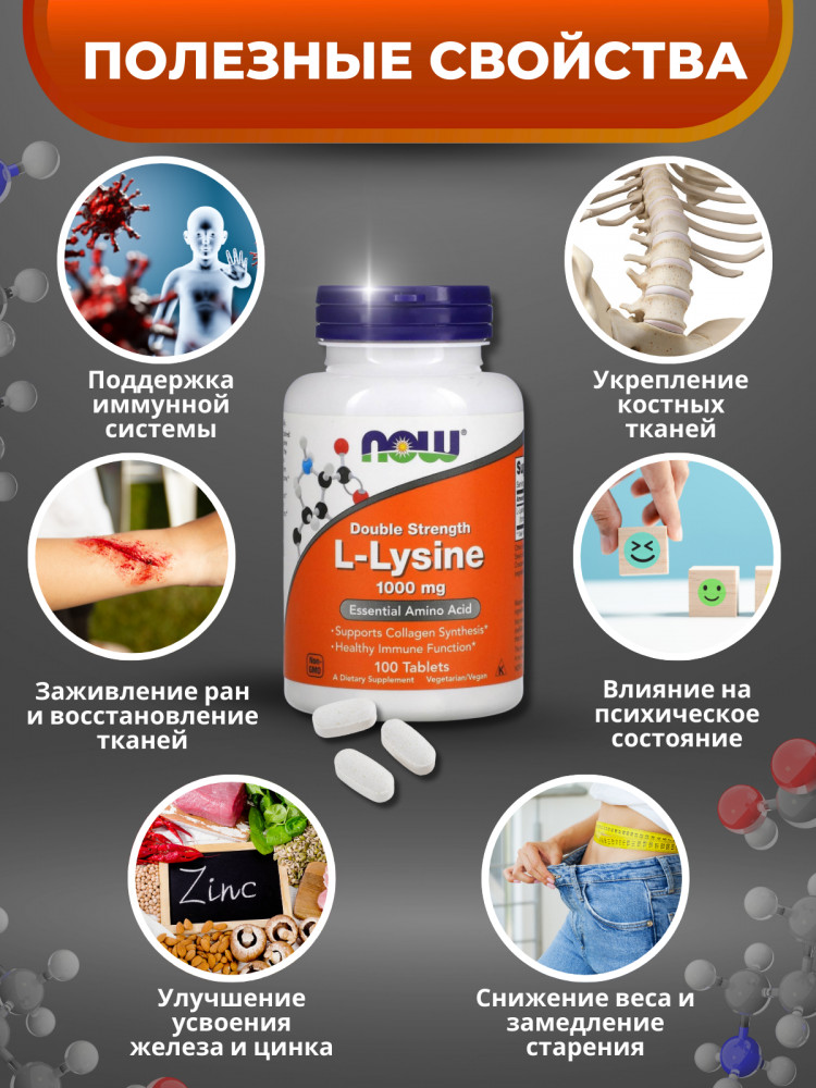L-лизин — это незаменимая аминокислота, которую необходимо получать из пищи или посредством приема добавок. Лизин необходим для производства всех белков в организме, а также для сохранения структурных белков коллагена и эластина, которые образуют все соединительные ткани (кожу, сухожилия и кости). L-лизин также является прекурсором L-карнитина, необходимого для метаболизма жиров и производства энергии. Кроме того, L-лизин помогает поддерживать здоровье иммунной системы и обеспечивает нормальную работу сердечно-сосудистой системы. |