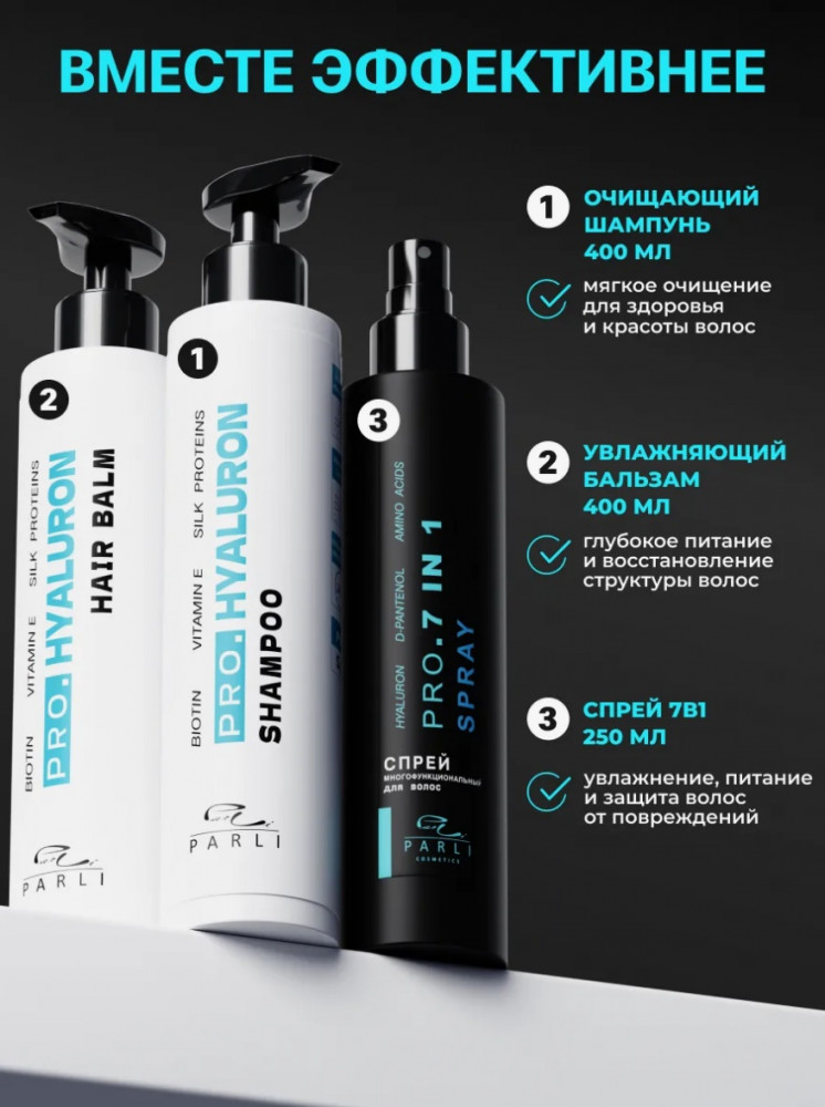 Спрей для волос: water (aqua); Glycerin; hydroxyethyl urea; D-Panthenol; Sodium Hyaluronate; PVP; PEG-PPG-15/15 Acetate Dimethicone; PEG-PPG 15/15 Allyl Ether Acetate; PEG/PPG-15/15 Acetate; Sodium Pca; Sodium Lactate; Arginine; Aspartic Acid; PCA; glycine; Alanine; Serine; Valine; Proline; Threonine.