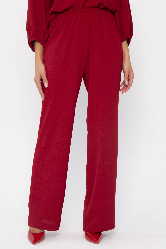 Женский костюм из жатой ткани. Блузка свободного силуэта с ассиметричным низом. Рукава 3/4 оформлены по низу на резиночке. Вырез горловины по переду блузки V-образной формы со складкой. Также оформлен завязками с декоративными элементами на концах. Брюки прямого кроя. Пояс на резинке подчеркивает талию и создает идеальную посадку, благодаря чему вы будете чувствовать себя уютно и уверенно. Этот костюм идеально подходит как для повседневных выходов, так и для более торжественных мероприятий.