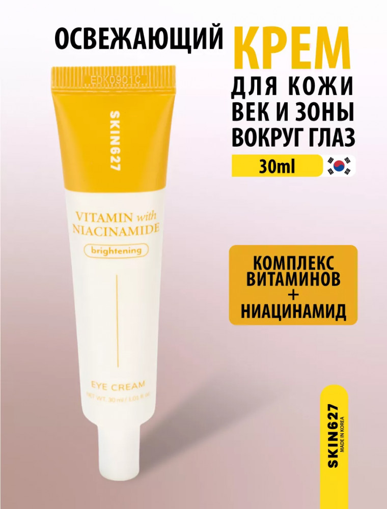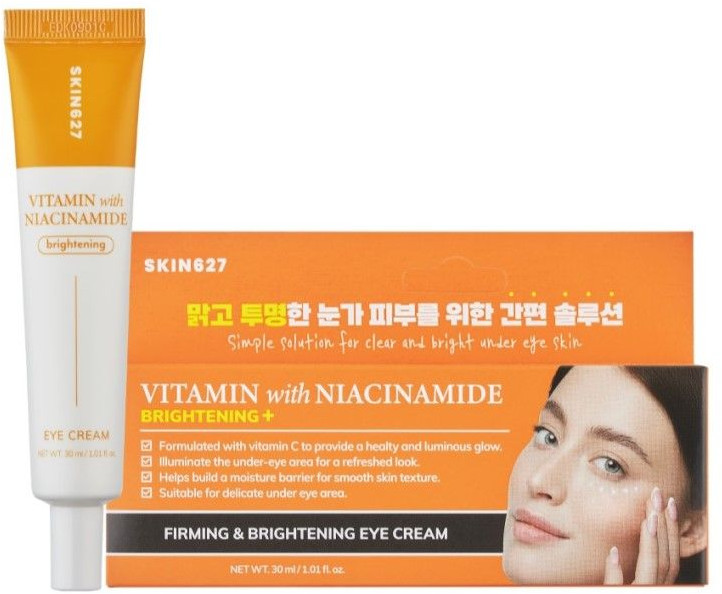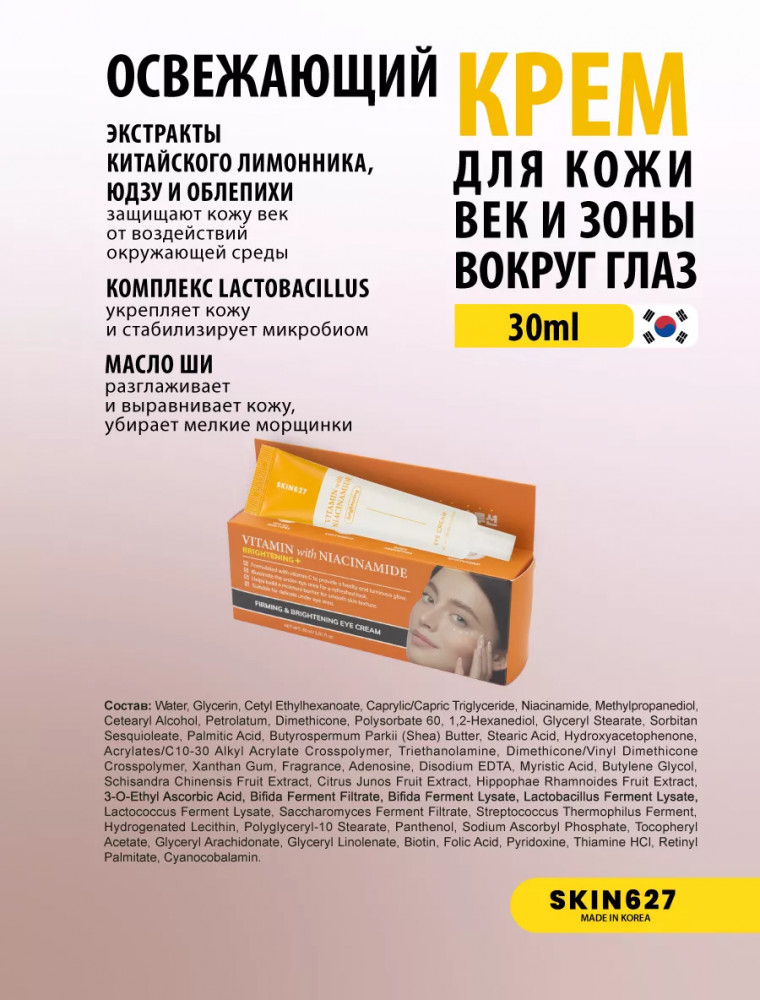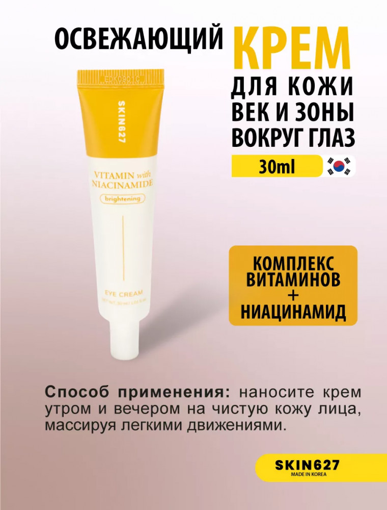 Brightening eye cream with Vitamin C and Niacinamide — осветляющий крем для век с комплексом из витамина С, 10 разных видов витаминов и ниацинамидом. Питает и насыщает кожу, осветляет, выравнивает тон, придает ей яркость и здоровый вид. Не содержит токсинов и парабенов, может применяться для всех типов кожи. Благодаря составу, крем активно борется с признаками усталости, уменьшая тёмные круги и отёчность. Он улучшает микроциркуляцию, помогает коже восстановить естественное сияние и делает взгляд свежим и отдохнувшим. Сочетание витамина С и ниацинамида в креме позволяет достичь комплексного эффекта: осветлить пигментацию, выровнять тон и текстуру кожи, уменьшить воспаления и придать лицу здоровое сияние. Легкая текстура крема обеспечивает быстрое впитывание, не утяжеляя кожу, и делает его идеальным для ежедневного использования. Крем помогает поддерживать оптимальный уровень увлажнённости, предотвращая появление сухости и шелушения.