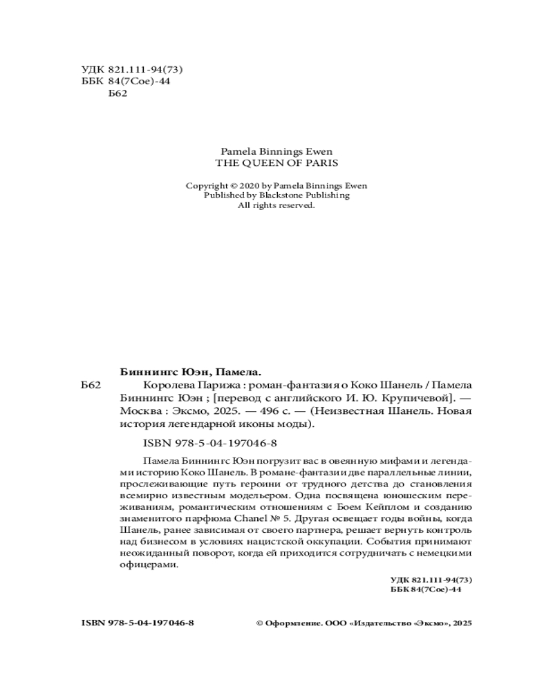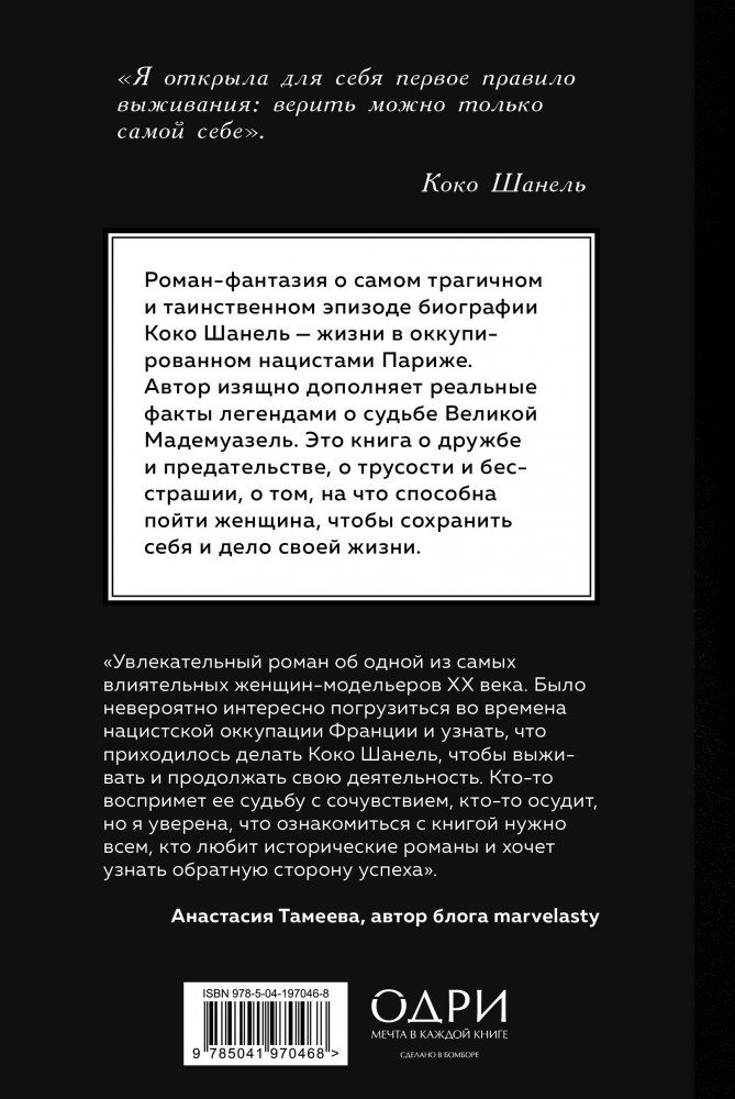 Серия: Неизвестная Шанель Роман-фантазия о самом трагичном и таинственном эпизоде в биографии Коко Шанель — жизни в оккупированном нацистами Париже. Автор изящно дополняет реальные факты легендами о судьбе Великой Мадемуазель. Это книга о дружбе и предательстве, о трусости и бесстрашии, о том, на что способна пойти женщина, чтобы сохранить себя и дело своей жизни. |