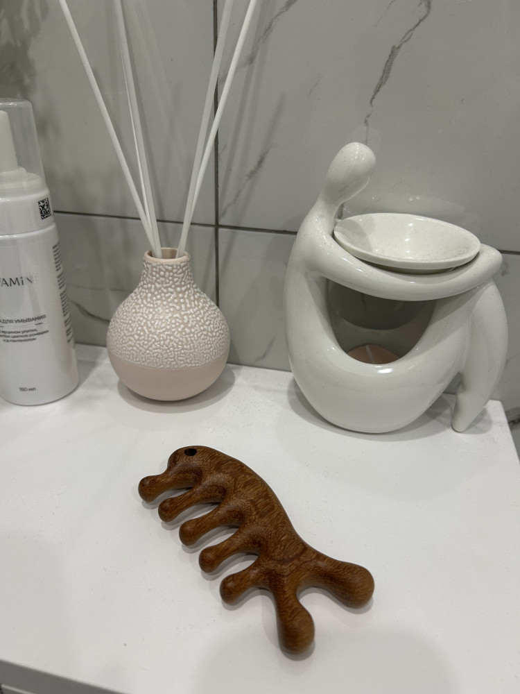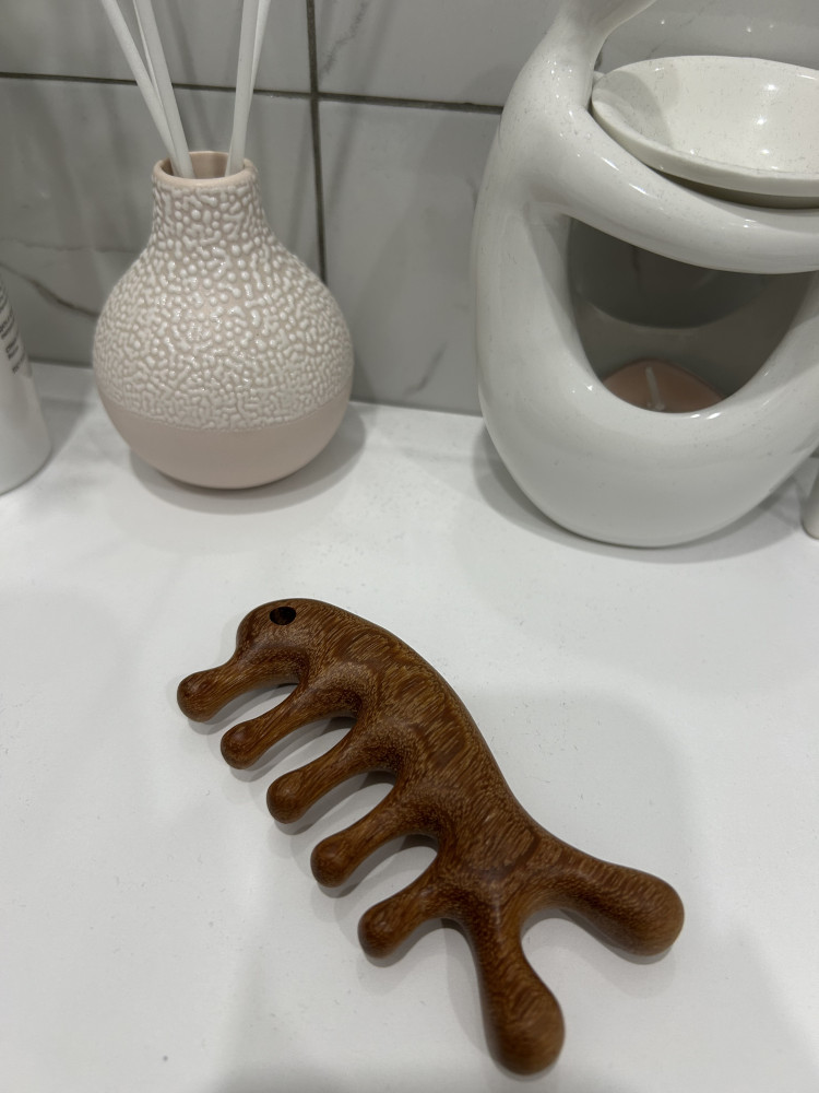 Orgin Деревянный гребень для массажацвет форма запах качество В данный момент этот товар отсутствует в продаже. Возможно, у нас найдется аналогичный или похожий товар здесь. Расческа гребень из сандалового дерева — это деревянная расческа для волос, которая также может использоваться в качестве массажной щетки. Изготовлена из натурального сандалового дерева, она не только прекрасно расчесывает волосы, но и обладает массажными свойствами, помогая улучшить кровообращение в коже головы и уменьшить напряжение мышц. Эта расческа-гребень идеально подходит для всех типов волос, включая кудрявые волосы. Кроме того, благодаря своей натуральной основе, она не повредит волосы и не вызовет статического эффекта. Если вы хотите ухаживать за своими волосами естественным способом, то расческа — гребень из сандалового дерева — отличный выбор для вас. Расческа для массажа гуаша может использоваться для проведения массажа лица, шеи и зоны декольте. |